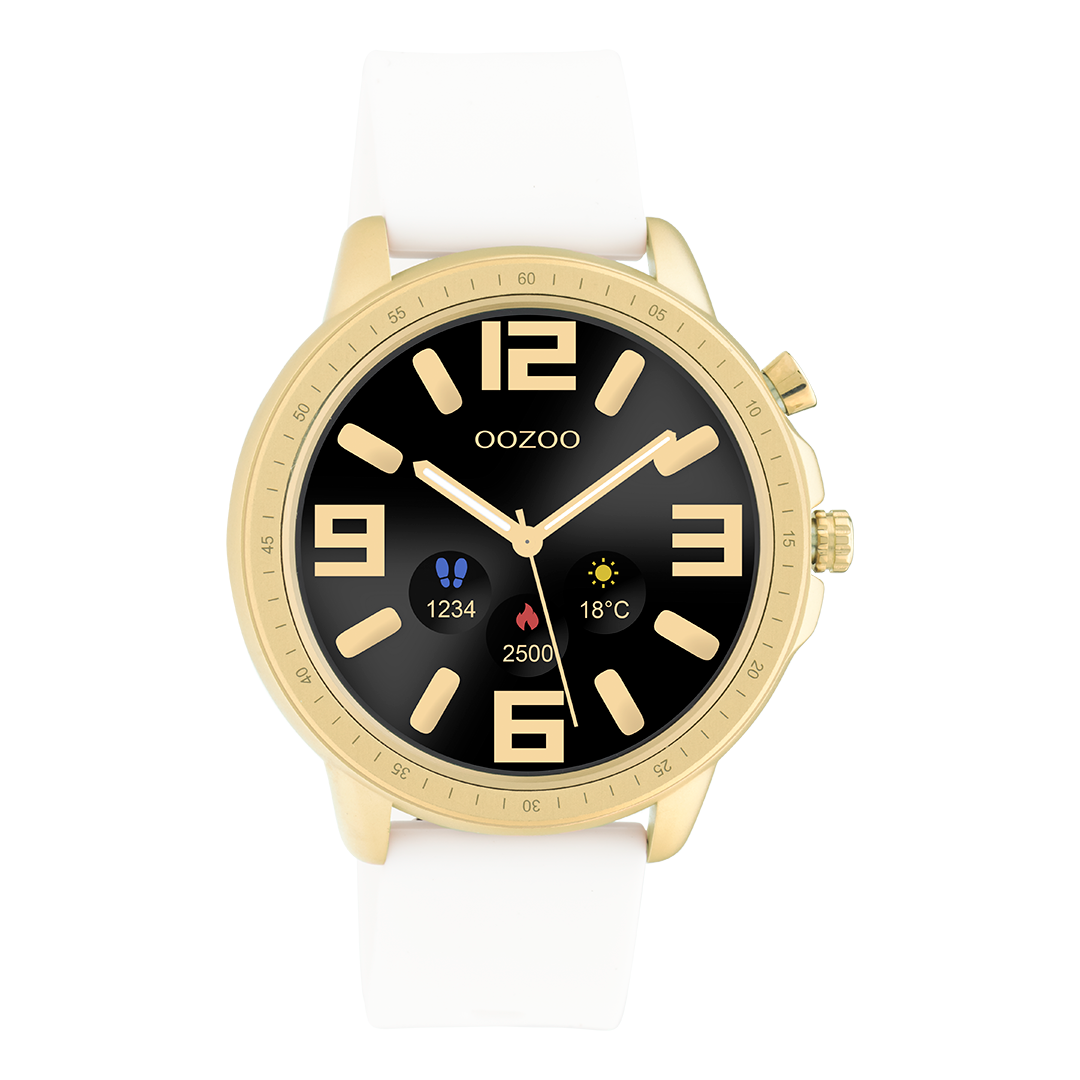 Get smart with us! Deze unisex smartwatch van OOZOO’s digitale collectie heeft een ronde horlogekast. De Q00316 is een van de meest elegante designs uit onze OOZOO Smartwatches collectie met een 45 mm goudkleurige metalen horlogekast. Dit essentiële accessoire heeft een mooie matte witte rubber band met witte gesp. Je kunt kiezen uit de veel verschillende stijlen van kleurrijke digitale OOZOO wijzerplaten. Het mineraalglas ligt in een 11,4 mm dikke metalen horlogekast en heeft een kunststof backplate en is nikkel-safe. Bij dit product wordt een oplader meegeleverd. Deze smartwatch is IP67 gecertificeerd en wordt gedekt door een garantie van 2 jaar (zie sectie 3 van onze Refund, shipping & warranty policy).