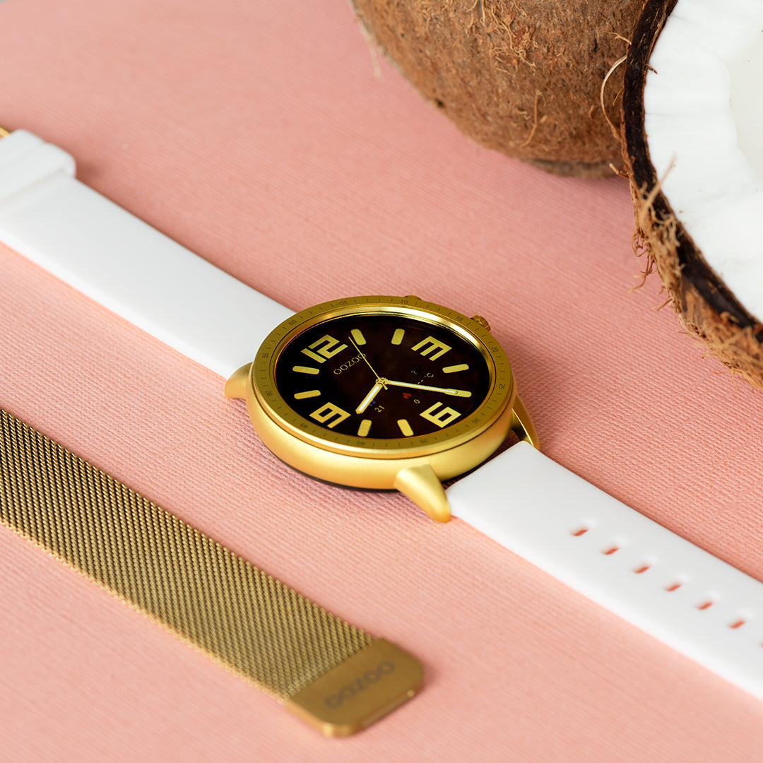 Goudkleurige smartwatch met witte rubber band