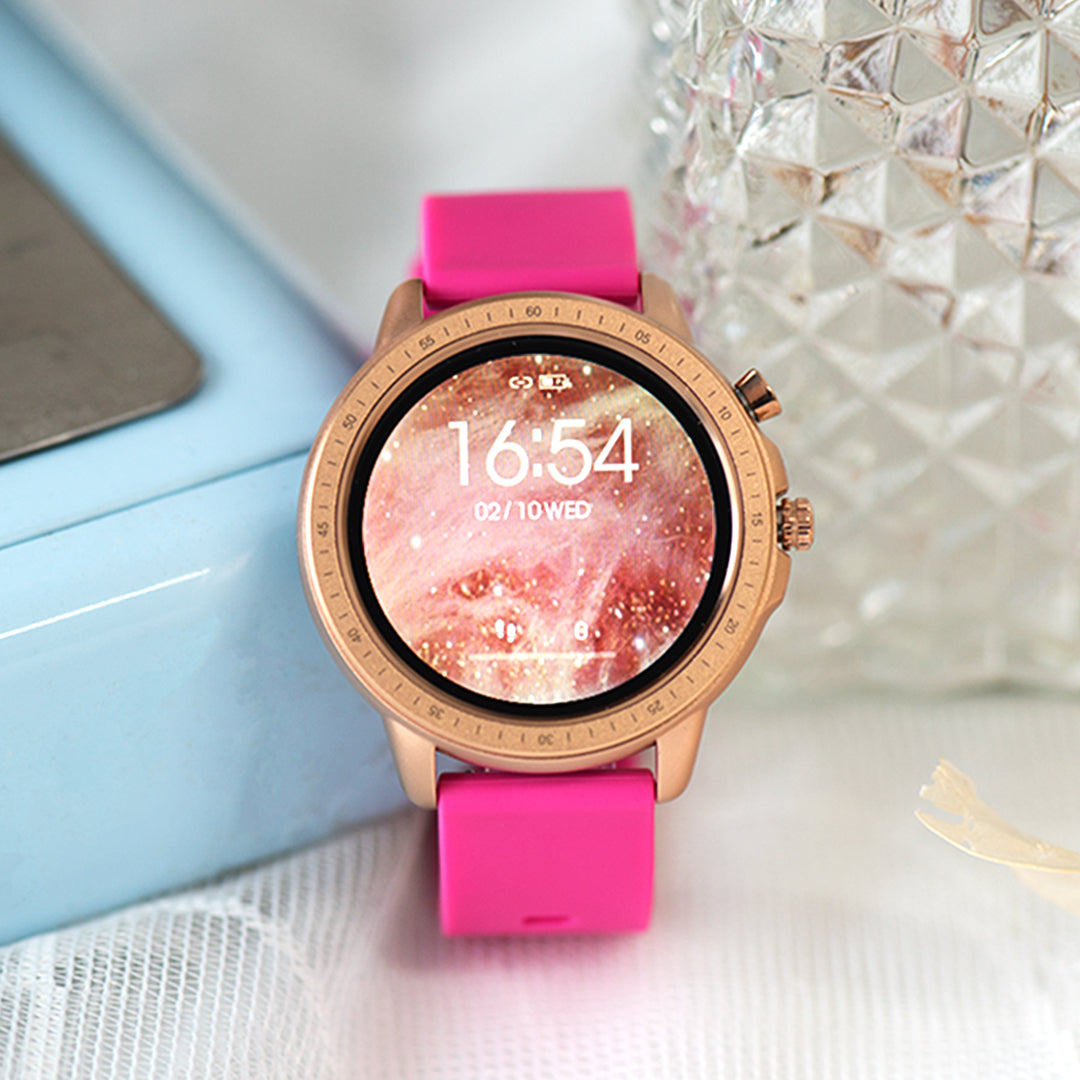 Rosé goudkleurige smartwatch met framboos roze rubber band