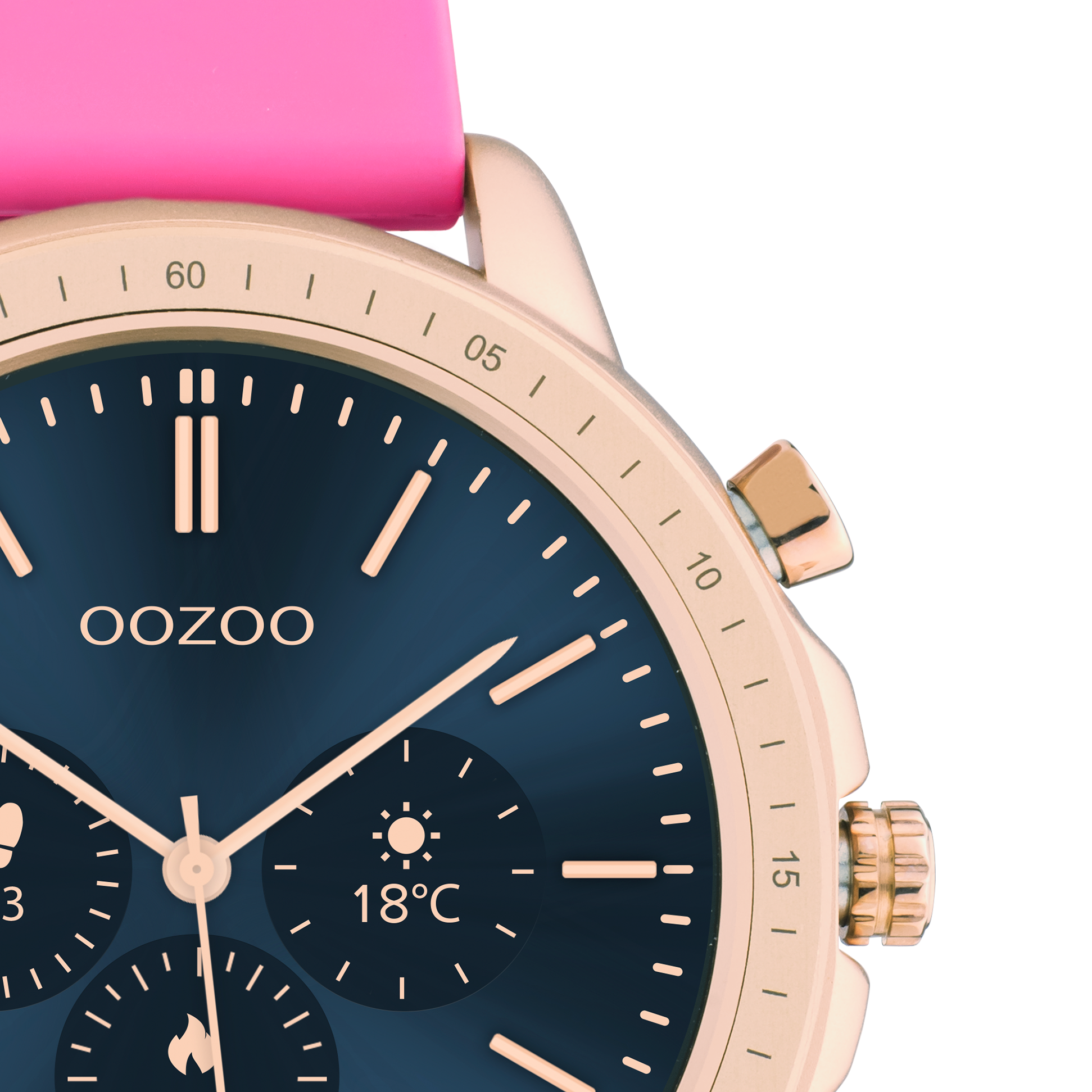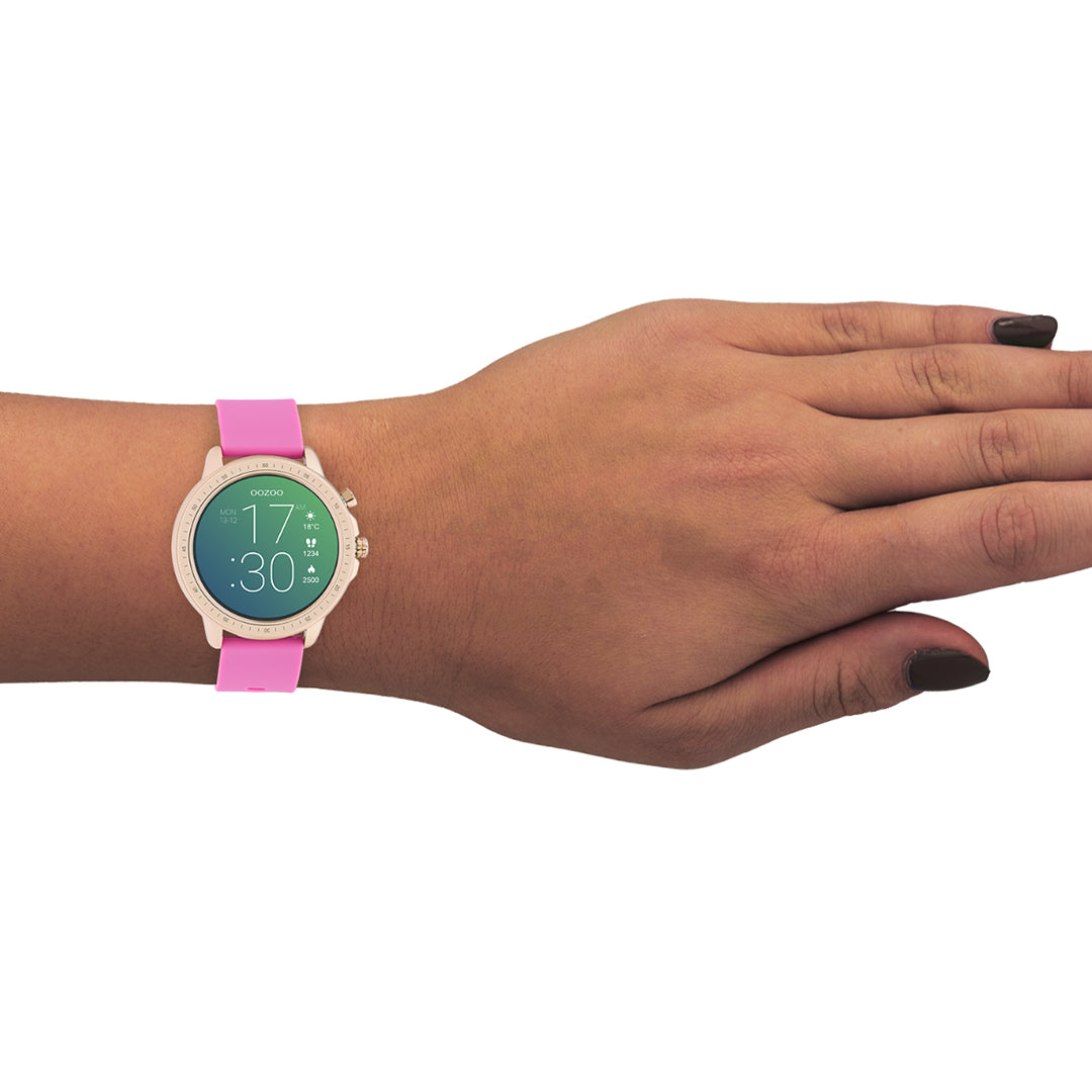 Get smart with us! Deze dames smartwatch van OOZOO’s digitale collectie heeft een ronde horlogekast. De Q00325 is een van de meest elegante designs uit onze OOZOO Smartwatches collectie met een 45 mm rosé goudkleurige metalen horlogekast. Dit essentiële accessoire heeft een mooie matte framboos roze rubber band met framboos roze gesp. Je kunt kiezen uit de veel verschillende stijlen van kleurrijke digitale OOZOO wijzerplaten. Het mineraalglas ligt in een 11,4 mm dikke metalen horlogekast en heeft een kunststof backplate en is nikkel-safe. Bij dit product wordt een oplader meegeleverd. Deze smartwatch is IP67 gecertificeerd en wordt gedekt door een garantie van 2 jaar (zie sectie 3 van onze Refund, shipping & warranty policy).