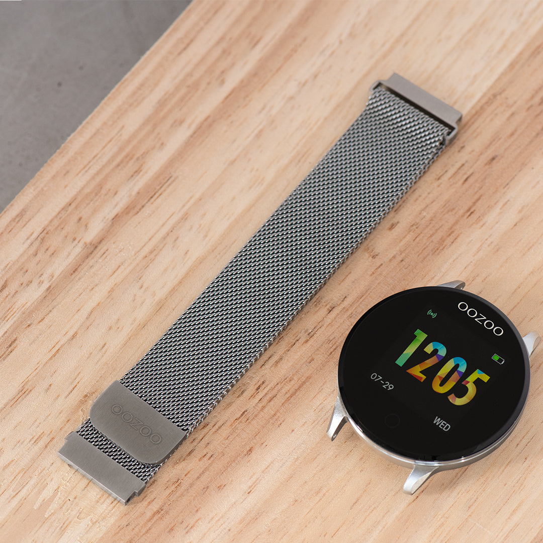 This unisex smartwatch watch strap gives you a totally new look! Switch the straps of your OOZOO Smartwatch for a difference of day and night. This magnetic silver metal mesh bracelet with silver clasp gives your smartwatch a completely different style. Be smart, all day and all night. This strap fits OOZOO Smartwatch designs Q00110-122, Q00130-139 & Q00300-332. All straps have a stainless steel clasp and are nickel safe. (For information about the warranty, see section 3 of our Refund, shipping & warranty policy).