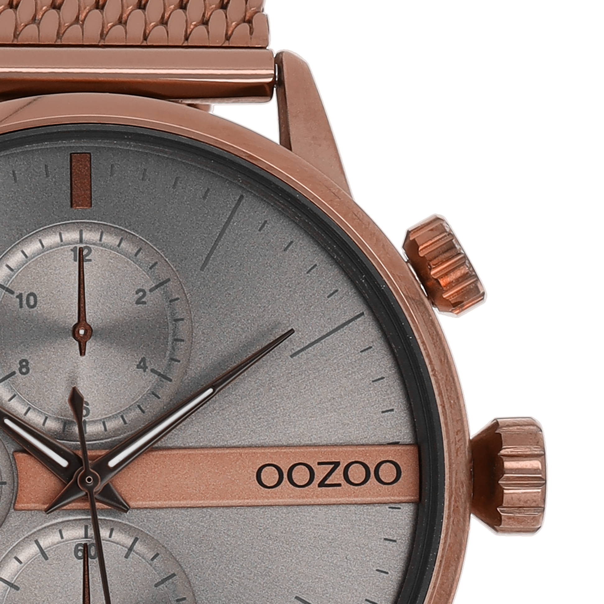 Val op met dit prachtige ronde heren design uit de trendy OOZOO Timepieces collectie. De C11103 heeft een bruine metalen mesh armband en 45 mm bruine metalen horlogekast. Maak een fashion statement met deze grijze chrono/sunray wijzerplaat, zilverkleurige strepen tijdsaanduidingen en bronskleurige wijzers. Dit horloge is een musthave voor jouw garderobe en heeft een mineraalglas, stainless steel achterplaat en is nikkel-safe. Dit horloge heeft een 2 Japans uurwerk en wordt gedekt door een garantie van 2 jaar (zie sectie 3 van onze Refund, shipping & warranty policy).