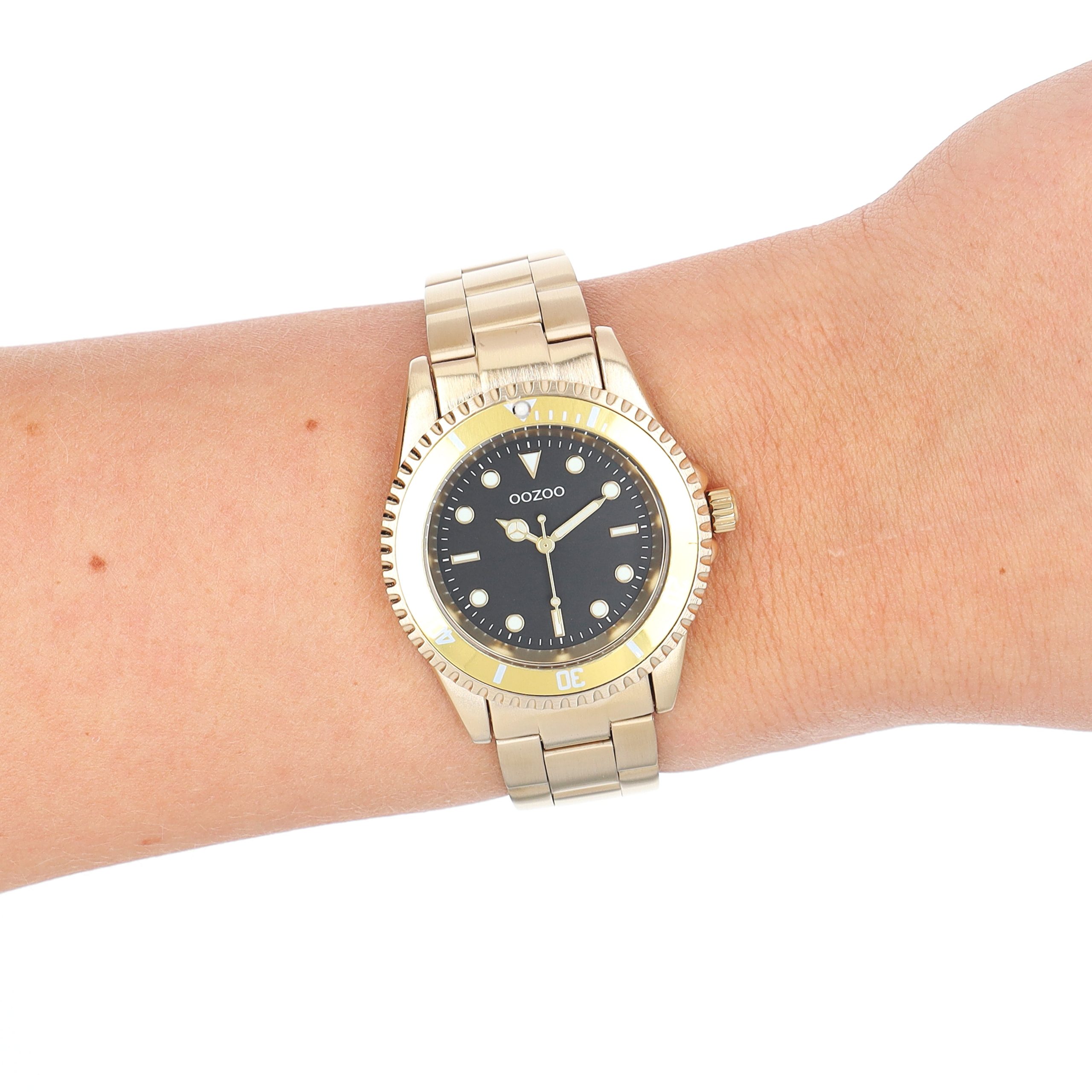 Val op met dit prachtige ronde dames design uit de trendy OOZOO Timepieces collectie. De C11148 heeft een goudkleurige roestvrijstalen armband en 36 mm goudkleurige metalen horlogekast. Maak een fashion statement met deze zwarte wijzerplaat, glow in the dark stippen en strepen tijdsaanduidingen en bijpassende wijzers. Dit horloge is een musthave voor jouw garderobe en heeft een mineraalglas, stainless steel achterplaat en is nikkel-safe. Dit horloge heeft een 2 Japans uurwerk en wordt gedekt door een garantie van 2 jaar (zie sectie 3 van onze Refund, shipping & warranty policy).