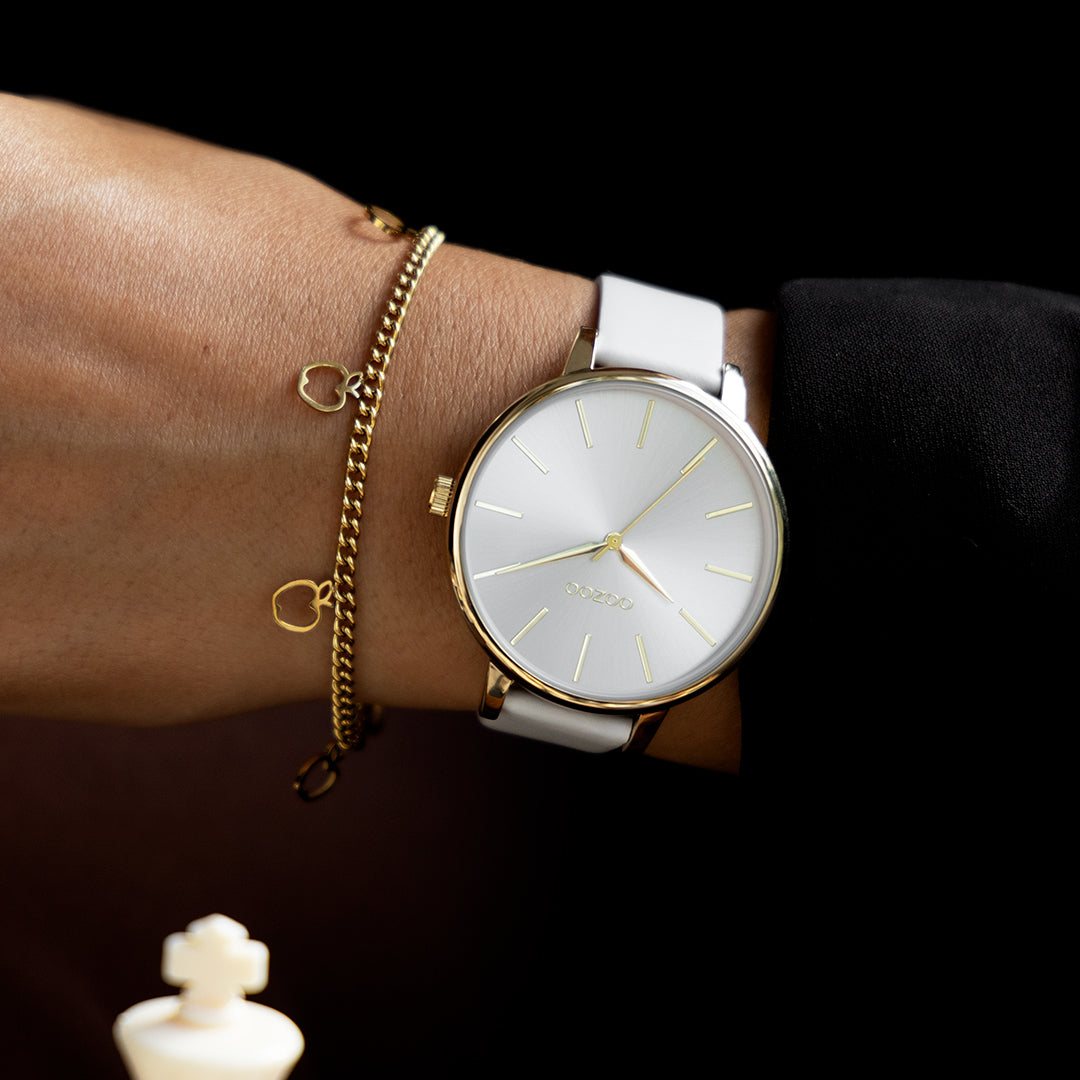 Goudkleurige horloge met licht grijze leren band
