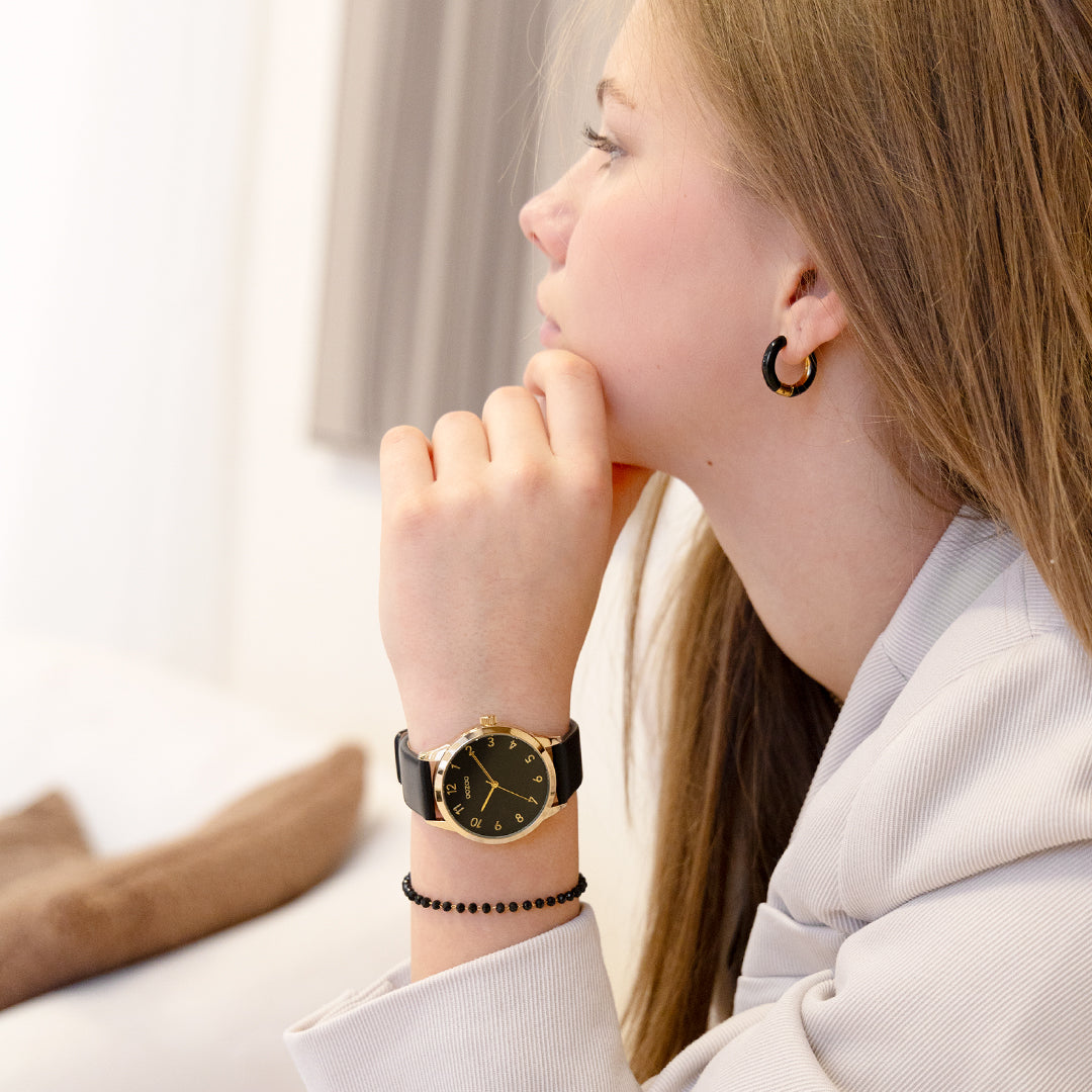 Val op met dit prachtige ronde dames design uit de trendy OOZOO Timepieces collectie. De C11329 heeft een zwarte leren band en 40 mm goudkleurige metalen horlogekast. Maak een fashion statement met deze zwarte wijzerplaat, goudkleurige cijfers tijdsaanduidingen en bijpassende wijzers. Dit horloge is een musthave voor jouw garderobe en heeft een mineraalglas, stainless steel achterplaat en is nikkel-safe. Dit horloge heeft een 2ATM Japans uurwerk en wordt gedekt door een garantie van 2 jaar (zie sectie 3 van onze Refund, shipping & warranty policy).