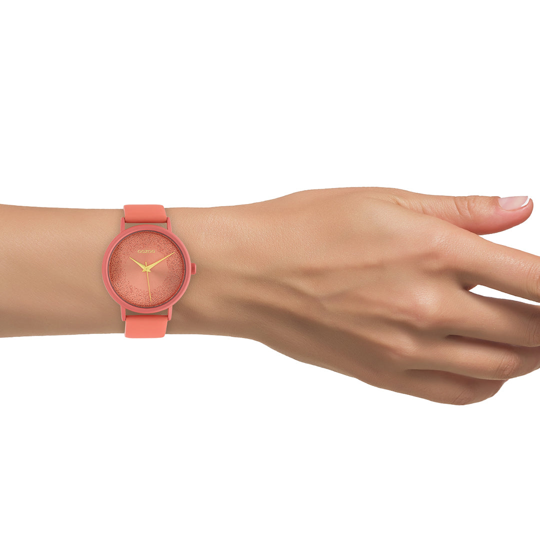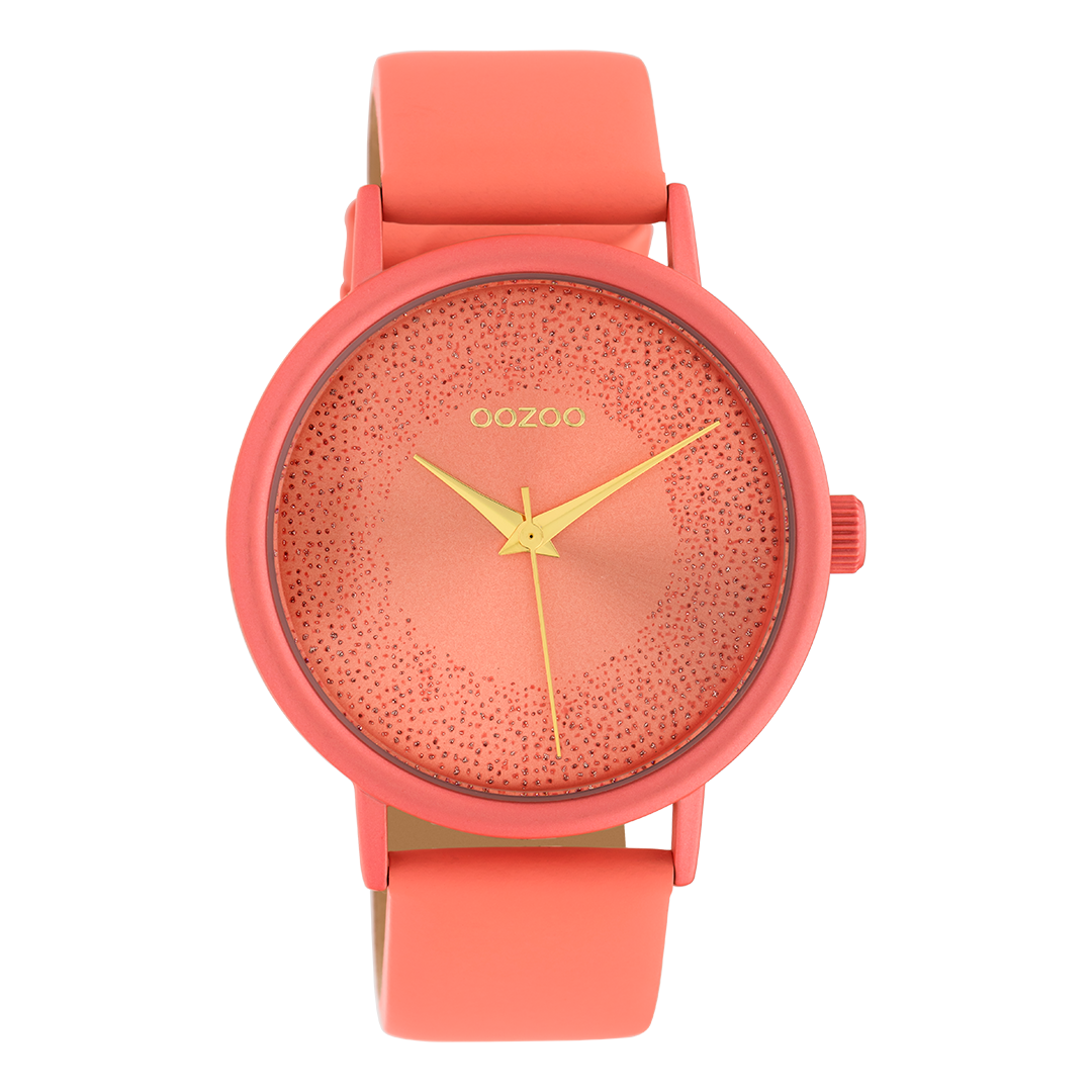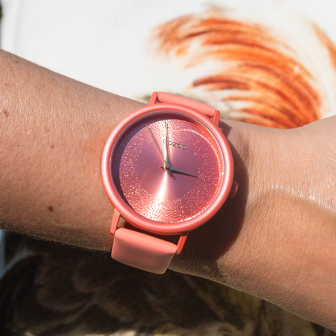 Val op met dit prachtige ronde dames design uit de trendy OOZOO Timepieces collectie. De C10580 heeft een perzik roze leren band en 42 mm perzik roze matte horlogekast. Maak een fashion statement met deze perzik roze sprankelende wijzerplaat, geen tijdsaanduidingen en goudkleurige wijzers. Dit horloge is een musthave voor jouw garderobe en heeft een mineraalglas, stainless steel achterplaat en is nikkel-safe. Dit horloge heeft een 2 Japans uurwerk en wordt gedekt door een garantie van 2 jaar (zie sectie 3 van onze Refund, shipping & warranty policy).
