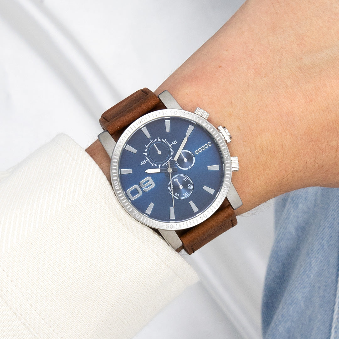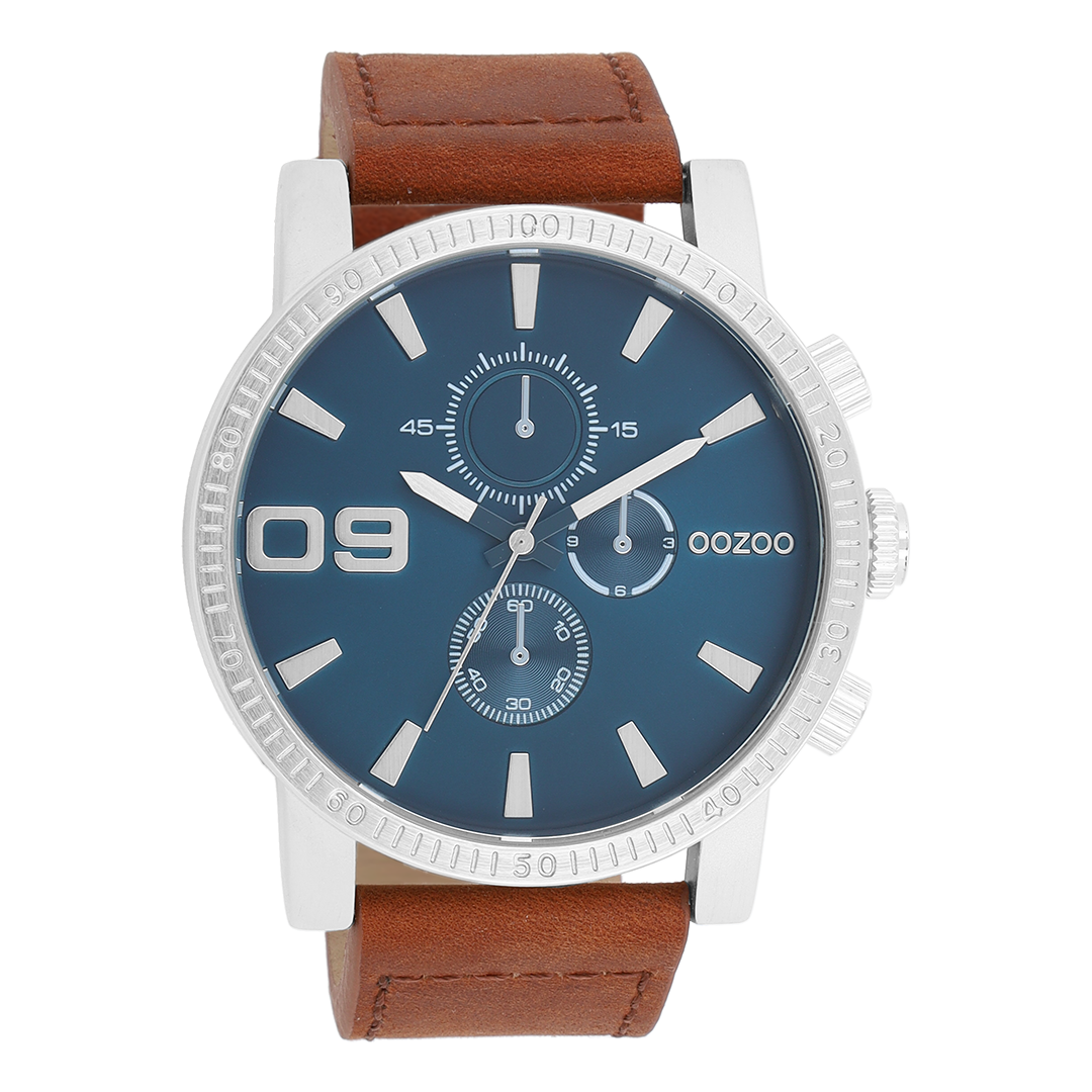 Val op met dit prachtige ronde heren design uit de trendy OOZOO Timepieces collectie. De C11210 heeft een gestikte bruine leren band en 48 mm zilverkleurige brushed metaal horlogekast. Maak een fashion statement met deze blauwe chrono/sunray wijzerplaat, zilverkleurige strepen tijdsaanduidingen en bijpassende wijzers. Dit horloge is een musthave voor jouw garderobe en heeft een mineraalglas, stainless steel achterplaat en is nikkel-safe. Dit horloge heeft een 2ATM Japans uurwerk en wordt gedekt door een garantie van 2 jaar (zie sectie 3 van onze Refund, shipping & warranty policy).