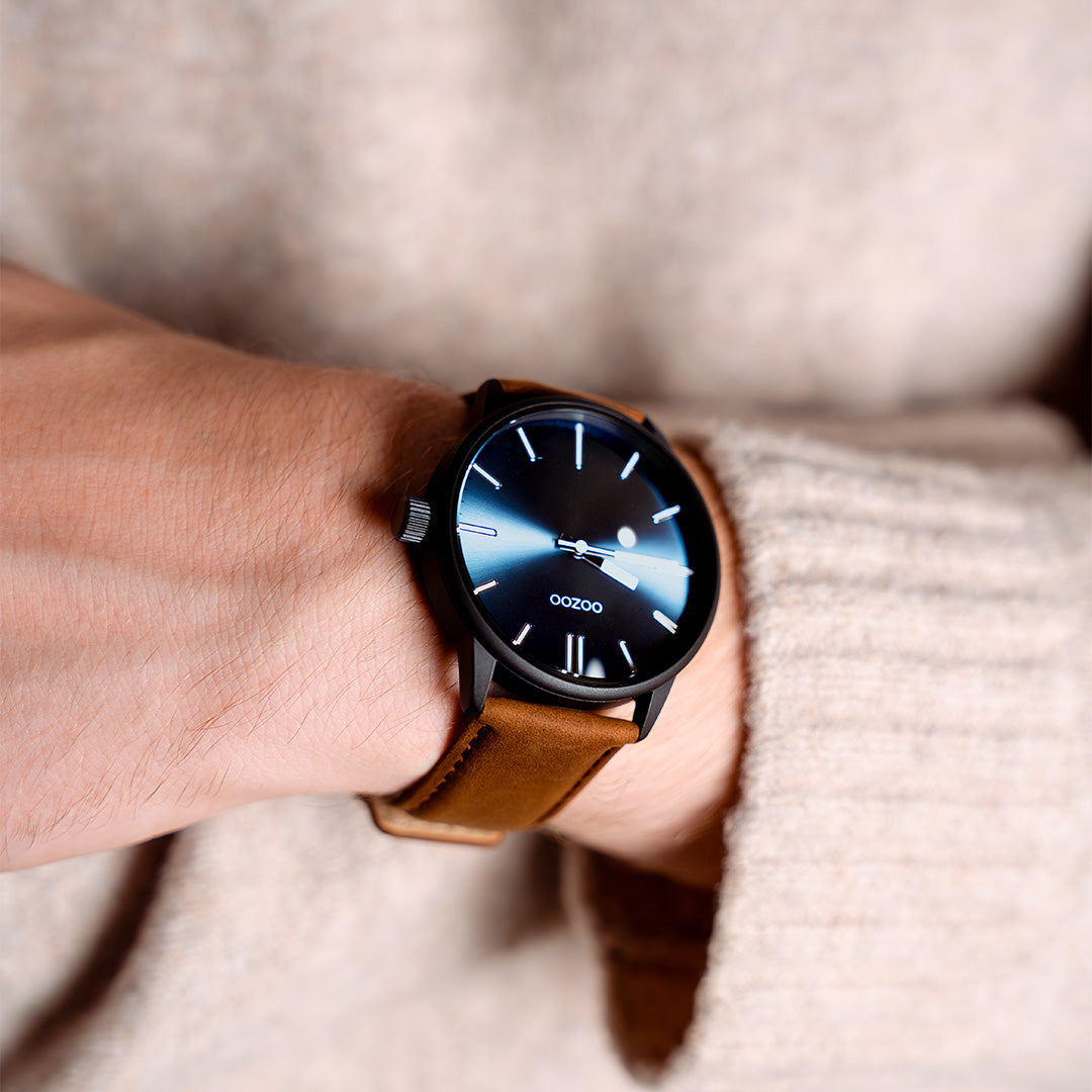 Val op met dit prachtige ronde heren design uit de trendy OOZOO Timepieces collectie. De C11401 heeft een gestikte bruine leren band en 45 mm zwarte matte horlogekast. Maak een fashion statement met deze blauwe sunray wijzerplaat, witte strepen tijdsaanduidingen en wit/zwarte wijzers. Dit horloge is een musthave voor jouw garderobe en heeft een mineraalglas, stainless steel achterplaat en is nikkel-safe. Dit horloge heeft een 2ATM Japans uurwerk en wordt gedekt door een garantie van 2 jaar (zie sectie 3 van onze Refund, shipping & warranty policy).