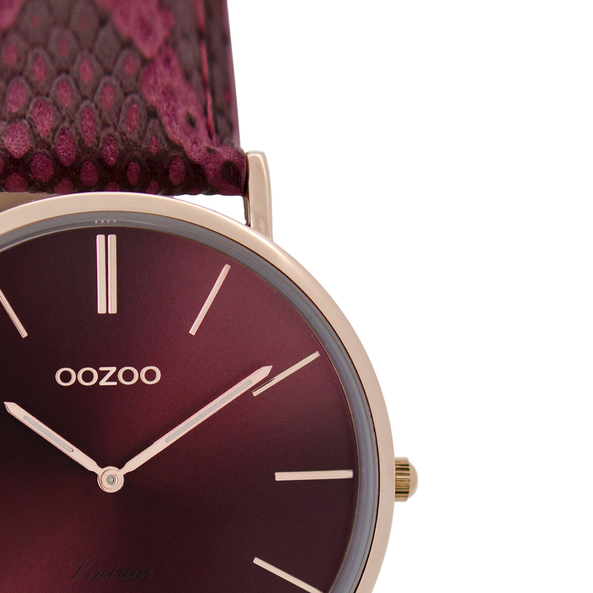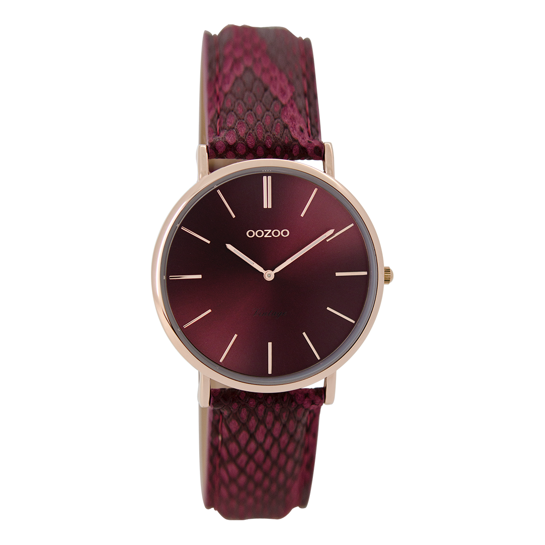 De klassieke look blijft centraal staan in deze trendy serie en daarom is dit OOZOO vintage ronde design met een speelse knipoog dé musthave van het seizoen! Dit dames horloge is de perfecte combinatie van comfort en fashion met zijn 32 mm rosé goudkleurige metalen horlogekast en bordeaux rode sunray wijzerplaat. De wijzerplaat heeft rosé goudkleurige strepen tijdsaanduidingen en bijpassende kleurige wijzers. De bordeaux rode slangen print leren band maakt dit horloge tot een trendy accessoire dat je elke dag kunt dragen. Dit horloge voegt de sprankeling toe aan je outfit. Het mineraalglas ligt in een 6,9 mm dunne metalen horlogekast met IP-plating. De C9306 heeft een stainless steel achterplaat en is nikkel-safe. Dit horloge heeft een 2 Japans uurwerk en wordt gedekt door een garantie van 2 jaar (zie sectie 3 van onze Refund, shipping & warranty policy).