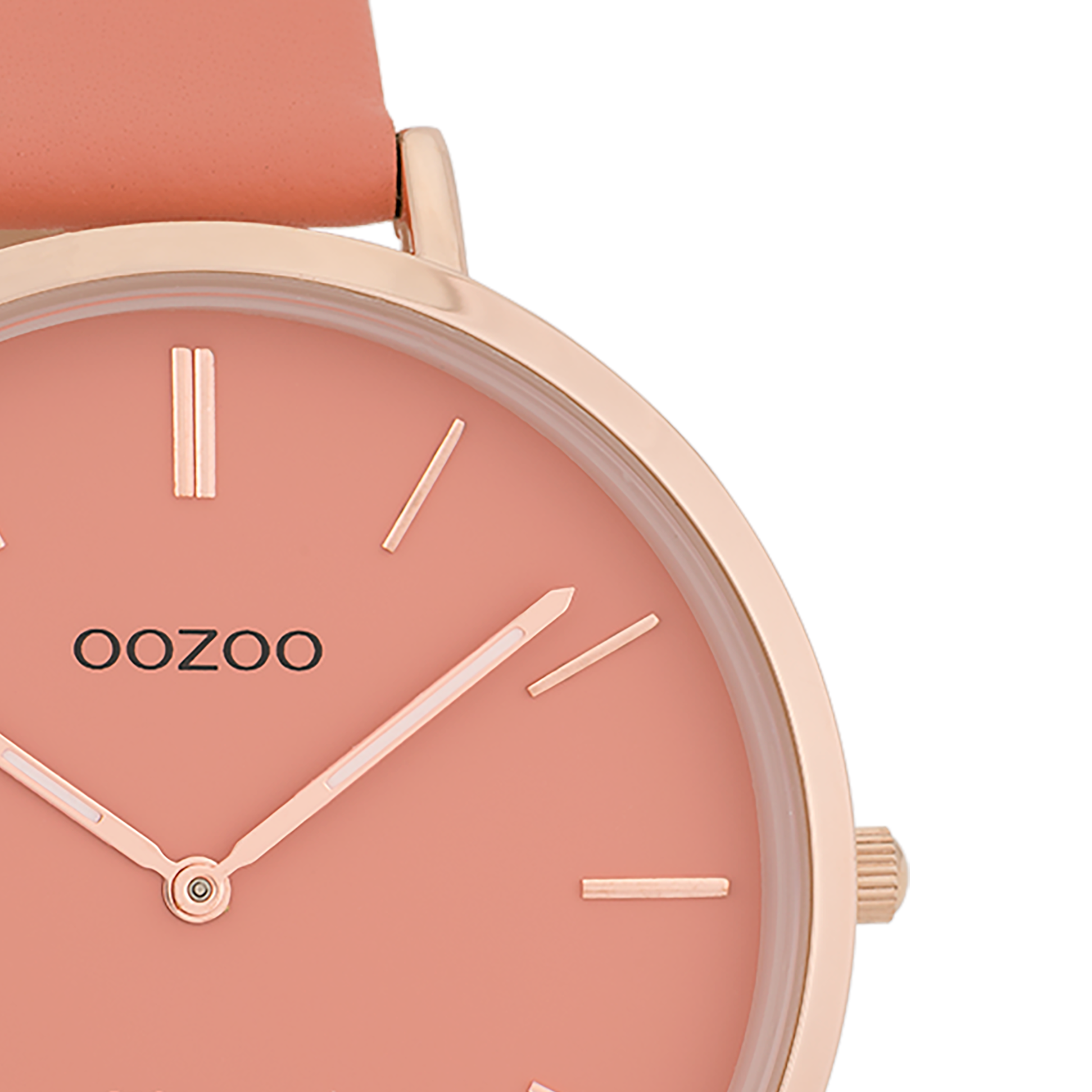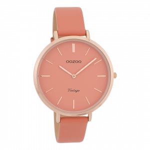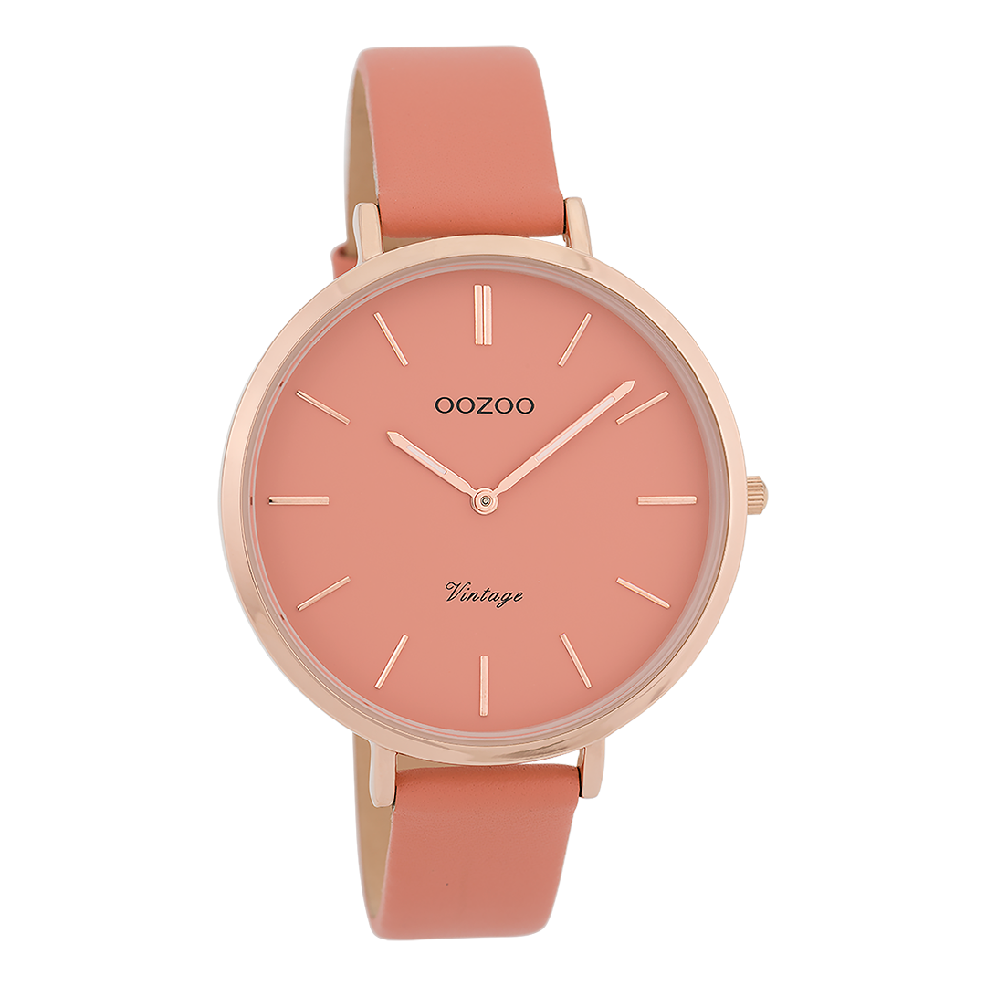 De klassieke look blijft centraal staan in deze trendy serie en daarom is dit OOZOO vintage ronde design met een speelse knipoog dé musthave van het seizoen! Dit unisex horloge is de perfecte combinatie van comfort en fashion met zijn 40 mm rosé goudkleurige metalen horlogekast en perzik roze wijzerplaat. De wijzerplaat heeft rosé goudkleurige strepen tijdsaanduidingen en bijpassende kleurige wijzers. De perzik roze leren band maakt dit horloge tot een trendy accessoire dat je elke dag kunt dragen. Dit horloge voegt de sprankeling toe aan je outfit. Het mineraalglas ligt in een 6,9 mm dunne metalen horlogekast met IP-plating. De C9806 heeft een stainless steel achterplaat en is nikkel-safe. Dit horloge heeft een 2 Japans uurwerk en wordt gedekt door een garantie van 2 jaar (zie sectie 3 van onze Refund, shipping & warranty policy).