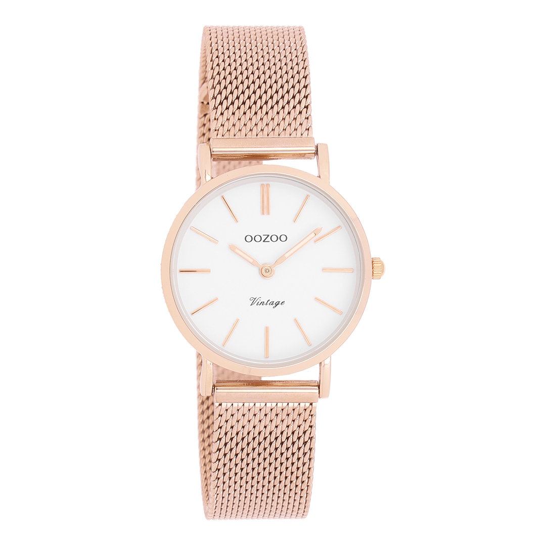 Verfijning en elegantie zijn de twee sleutelelementen van deze prachtige OOZOO Vintage series. Dit klassieke ronde model past bij iedereen. Dit unisex horloge is de perfecte combinatie van comfort en fashion met zijn 28 mm rosé goudkleurige metalen horlogekast en witte wijzerplaat. De rosé goudkleurige metalen mesh armband maakt dit horloge tot een all-time classic welke je bij iedere gelegenheid kunt dragen. De wijzerplaat heeft rosé goudkleurige strepen tijdsaanduidingen en bijpassende kleurige wijzers. Dit model is een must-have voor jouw dagelijkse garderobe. Het mineraalglas ligt in een 6,9 mm dunne metalen horlogekast met IP-plating. De C20233 heeft een stainless steel achterplaat en is nikkel-safe. Dit horloge heeft een 2 Japans uurwerk en wordt gedekt door een garantie van 2 jaar (zie sectie 3 van onze Refund, shipping & warranty policy).