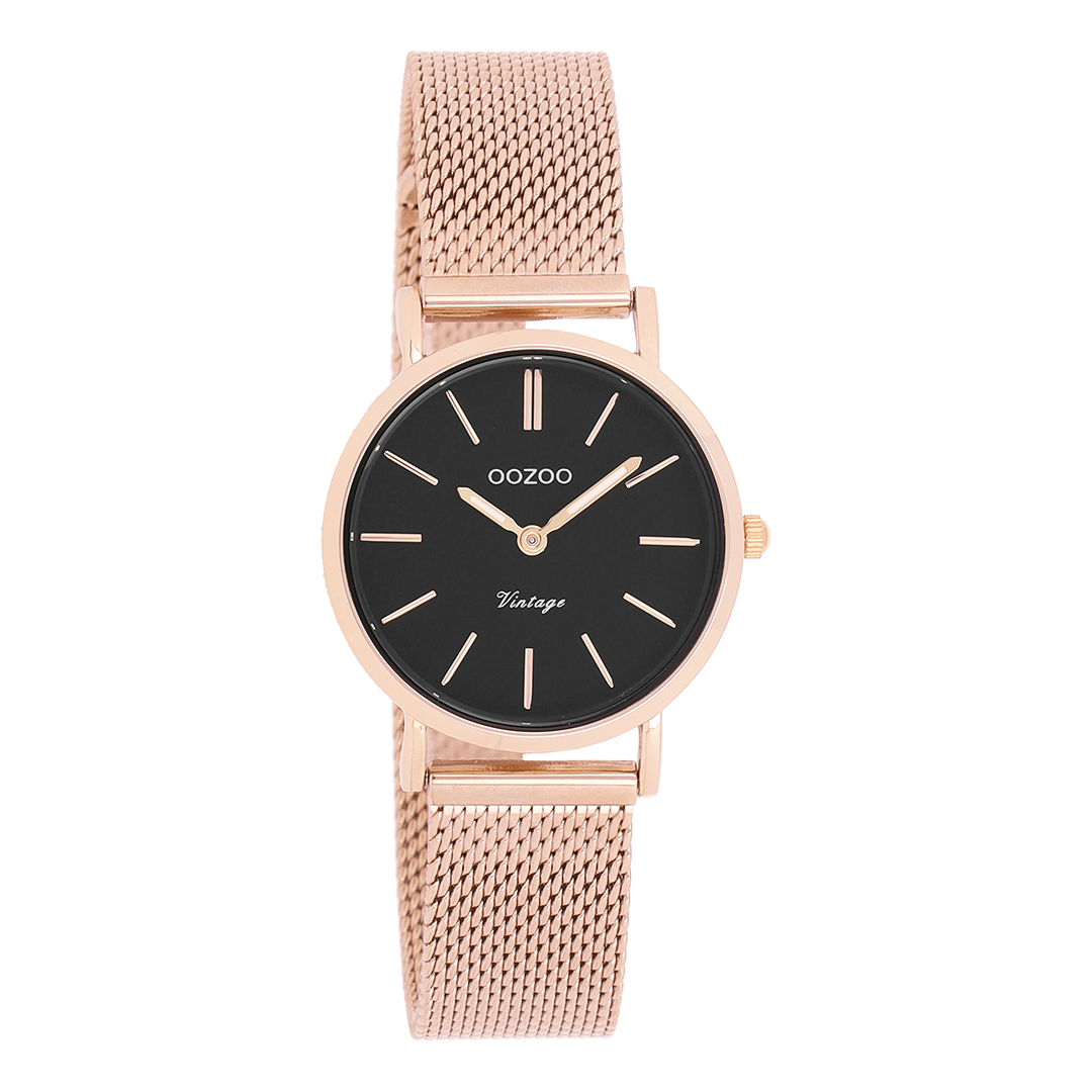 Verfijning en elegantie zijn de twee sleutelelementen van deze prachtige OOZOO Vintage series. Dit klassieke ronde model past bij iedereen. Dit unisex horloge is de perfecte combinatie van comfort en fashion met zijn 28 mm rosé goudkleurige metalen horlogekast en zwarte wijzerplaat. De rosé goudkleurige metalen mesh armband maakt dit horloge tot een all-time classic welke je bij iedere gelegenheid kunt dragen. De wijzerplaat heeft rosé goudkleurige strepen tijdsaanduidingen en bijpassende kleurige wijzers. Dit model is een must-have voor jouw dagelijkse garderobe. Het mineraalglas ligt in een 6,9 mm dunne metalen horlogekast met IP-plating. De C20234 heeft een stainless steel achterplaat en is nikkel-safe. Dit horloge heeft een 2 Japans uurwerk en wordt gedekt door een garantie van 2 jaar (zie sectie 3 van onze Refund, shipping & warranty policy).