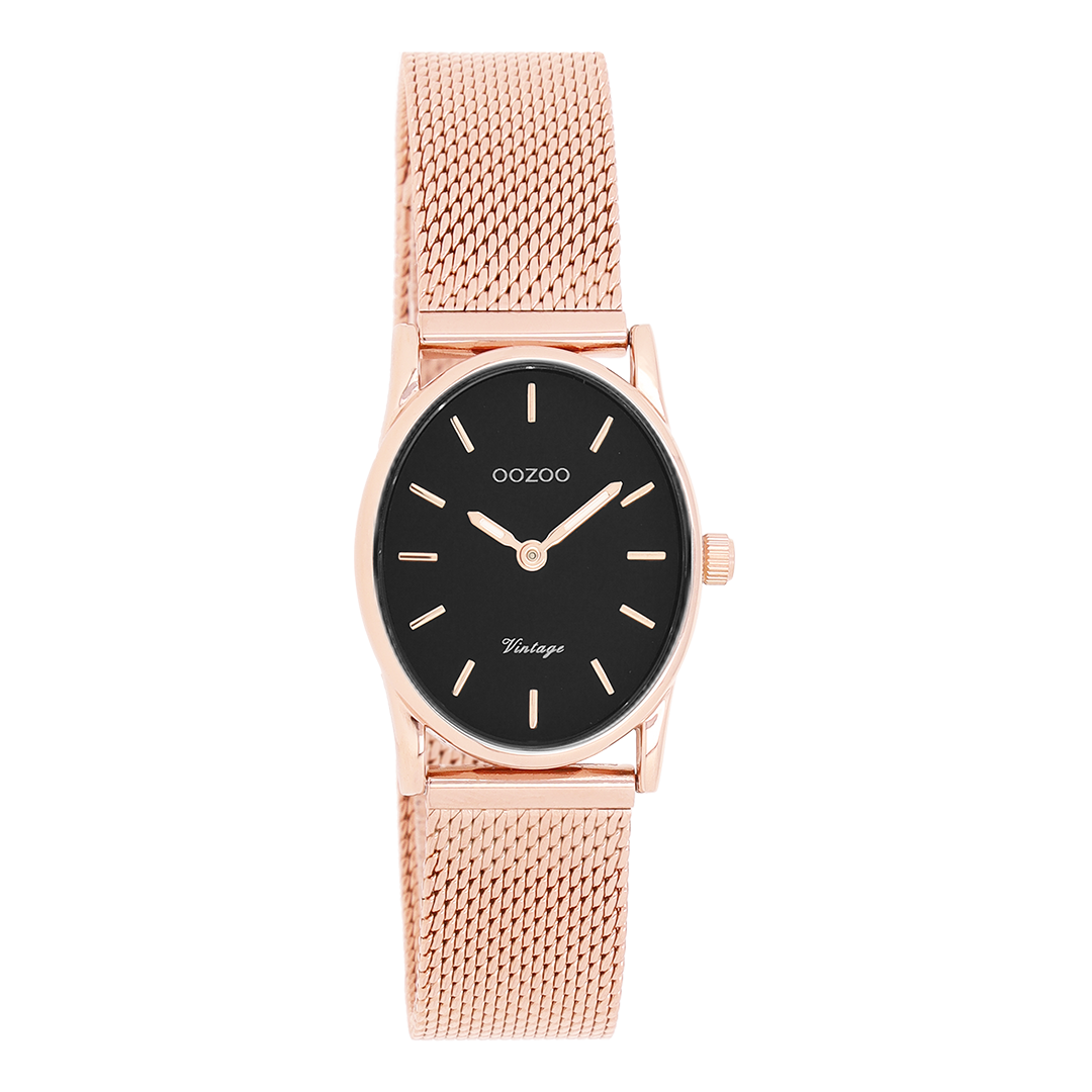 De klassieke look blijft centraal staan in deze trendy serie en daarom is dit OOZOO vintage ovale design met een speelse knipoog dé musthave van het seizoen! Dit dames horloge is de perfecte combinatie van comfort en fashion met zijn 28×22,5 mm rosé goudkleurige metalen horlogekast en zwarte wijzerplaat. De wijzerplaat heeft rosé goudkleurige strepen tijdsaanduidingen en rosé goudkleurige kleurige wijzers. De rosé goudkleurige glanzende metalen mesh armband maakt dit horloge tot een trendy accessoire dat je elke dag kunt dragen. Dit horloge voegt de sprankeling toe aan je outfit. Het mineraalglas ligt in een 6,9 mm dunne metalen horlogekast met IP-plating. De C20260 heeft een stainless steel achterplaat en is nikkel-safe. Dit horloge heeft een 2 Japans uurwerk en wordt gedekt door een garantie van 2 jaar (zie sectie 3 van onze Refund, shipping & warranty policy).