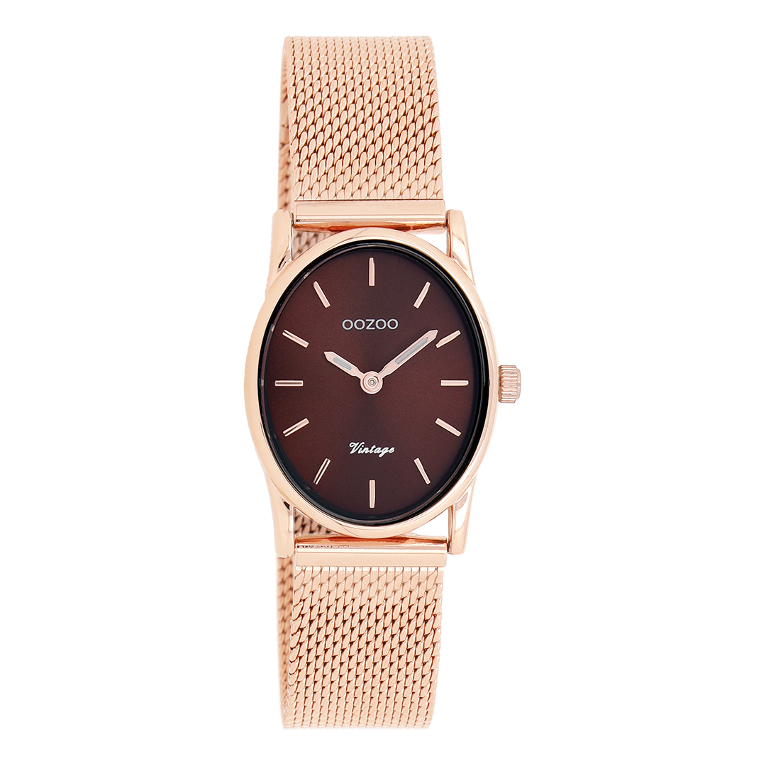 Verfijning en elegantie zijn de twee sleutelelementen van deze prachtige OOZOO Vintage series. Dit klassieke ovale model past bij iedereen. Dit dames horloge is de perfecte combinatie van comfort en fashion met zijn 28×22,5 mm rosé goudkleurige metalen horlogekast en bruine sunray wijzerplaat. De rosé goudkleurige metalen mesh armband maakt dit horloge tot een all-time classic welke je bij iedere gelegenheid kunt dragen. De wijzerplaat heeft rosé goudkleurige strepen tijdsaanduidingen en bijpassende kleurige wijzers. Dit model is een must-have voor jouw dagelijkse garderobe. Het mineraalglas ligt in een 6,9 mm dunne metalen horlogekast met IP-plating. De C10968 heeft een stainless steel achterplaat en is nikkel-safe. Dit horloge heeft een 2 Japans uurwerk en wordt gedekt door een garantie van 2 jaar (zie sectie 3 van onze Refund, shipping & warranty policy).