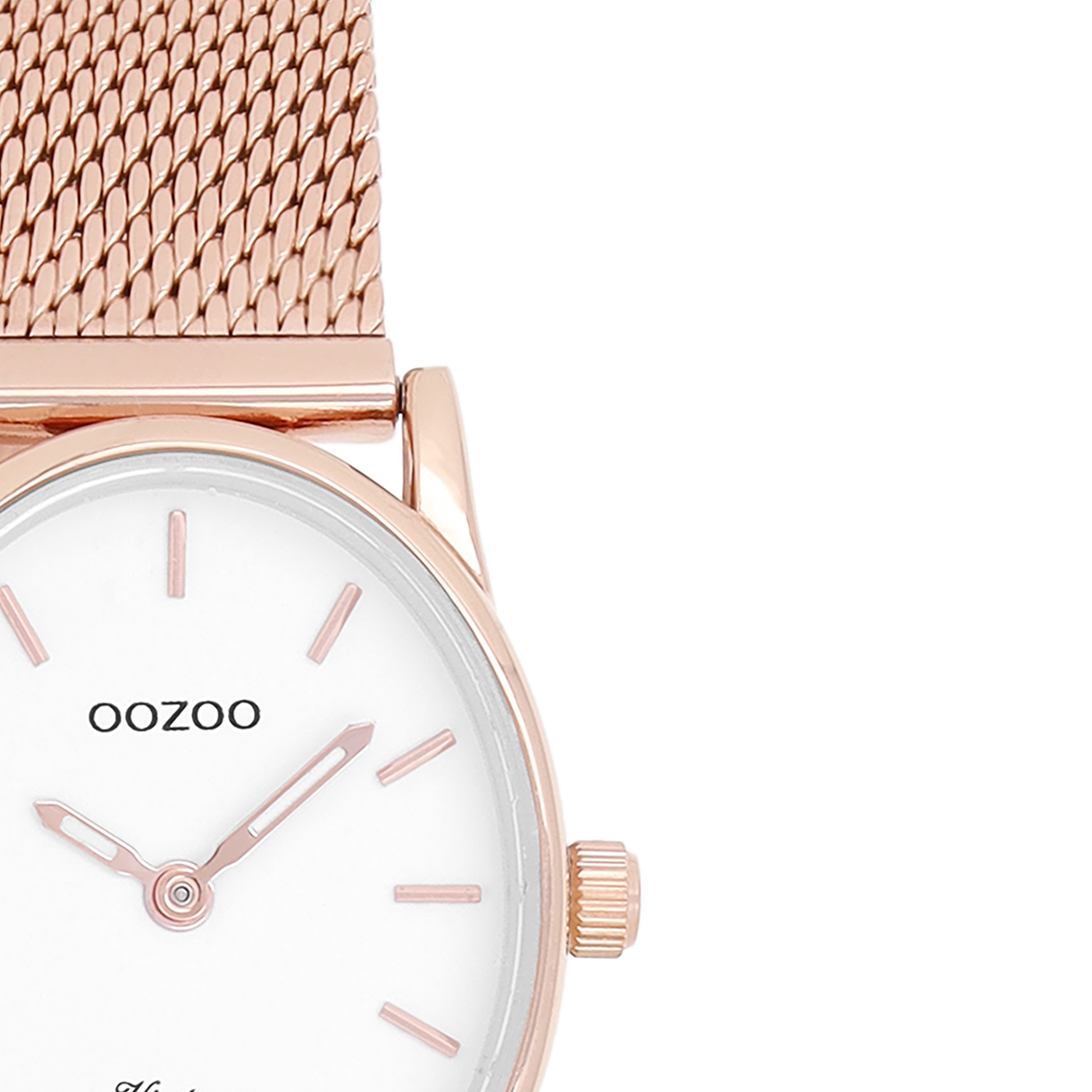 Rosé goudkleurige horloge met rosé goudkleurige metalen mesh armband