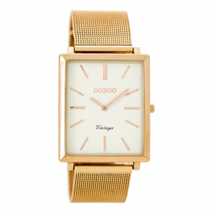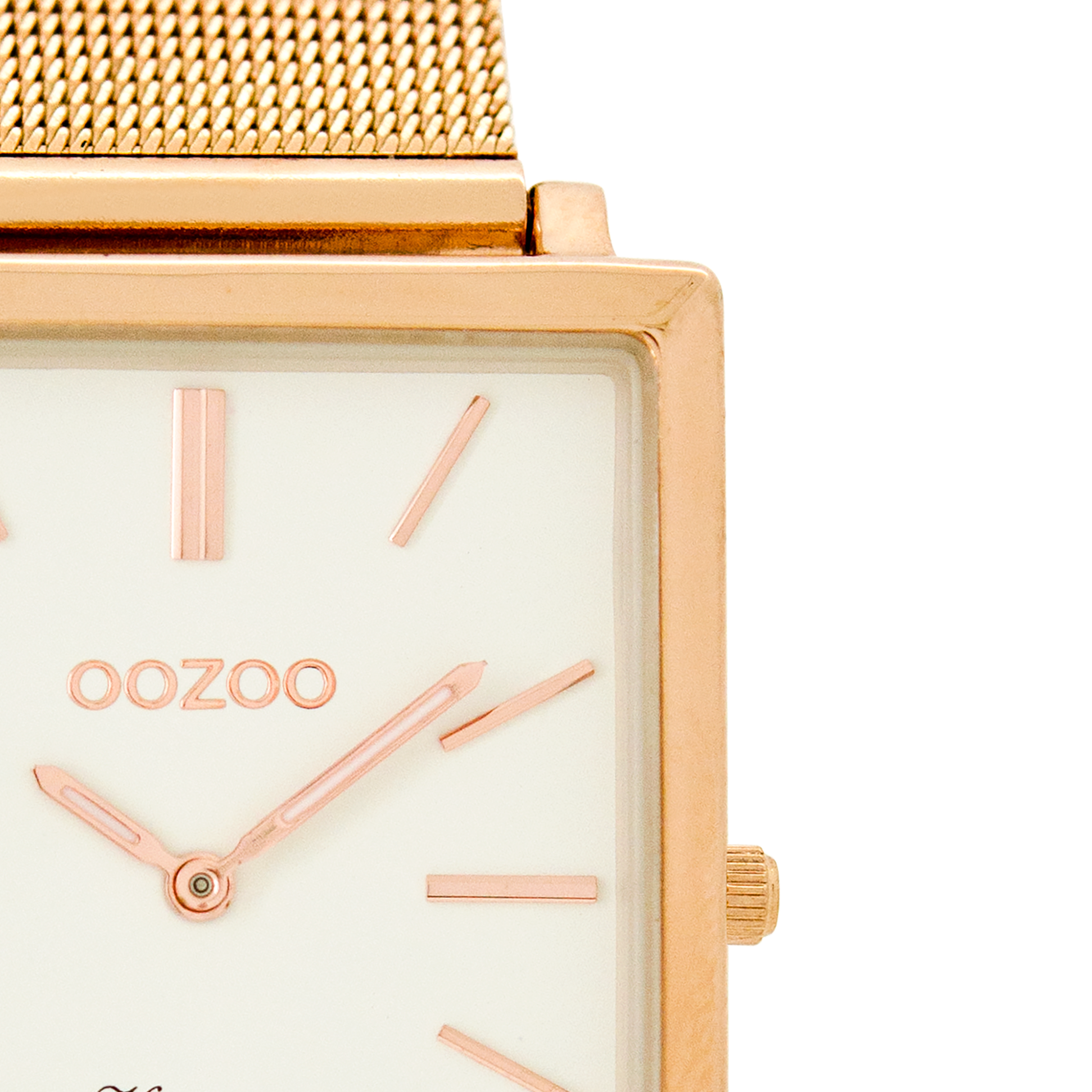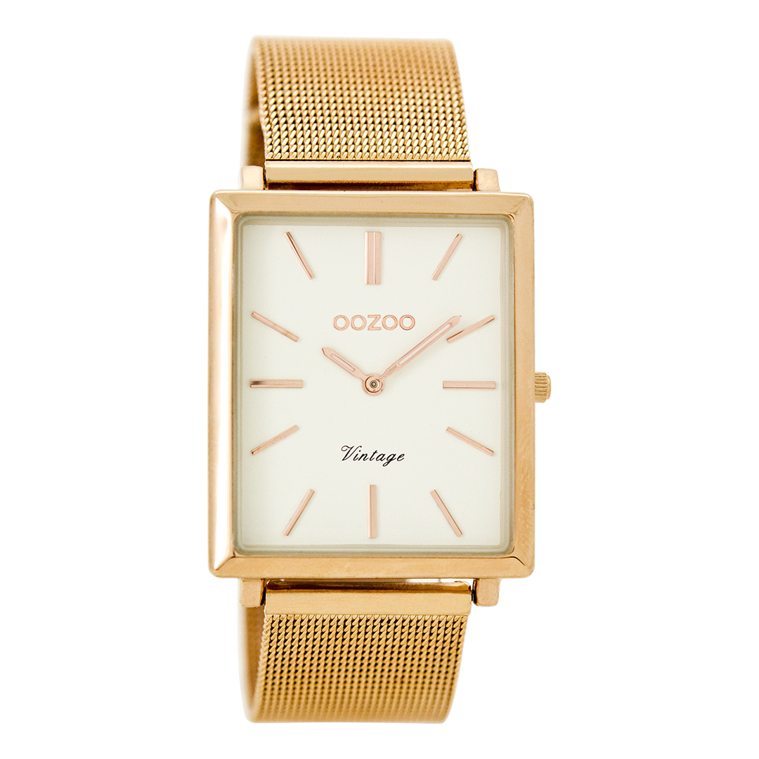 De klassieke look blijft centraal staan in deze trendy serie en daarom is dit OOZOO vintage vierkante design met een speelse knipoog dé musthave van het seizoen! Dit unisex horloge is de perfecte combinatie van comfort en fashion met zijn 37×31 mm rosé goudkleurige metalen horlogekast en witte wijzerplaat. De wijzerplaat heeft rosé goudkleurige strepen tijdsaanduidingen en bijpassende kleurige wijzers. De rosé goudkleurige metalen mesh armband maakt dit horloge tot een trendy accessoire dat je elke dag kunt dragen. Dit horloge voegt de sprankeling toe aan je outfit. Het mineraalglas ligt in een 6,9 mm dunne metalen horlogekast met IP-plating. De C8183 heeft een stainless steel achterplaat en is nikkel-safe. Dit horloge heeft een 2 Japans uurwerk en wordt gedekt door een garantie van 2 jaar (zie sectie 3 van onze Refund, shipping & warranty policy).