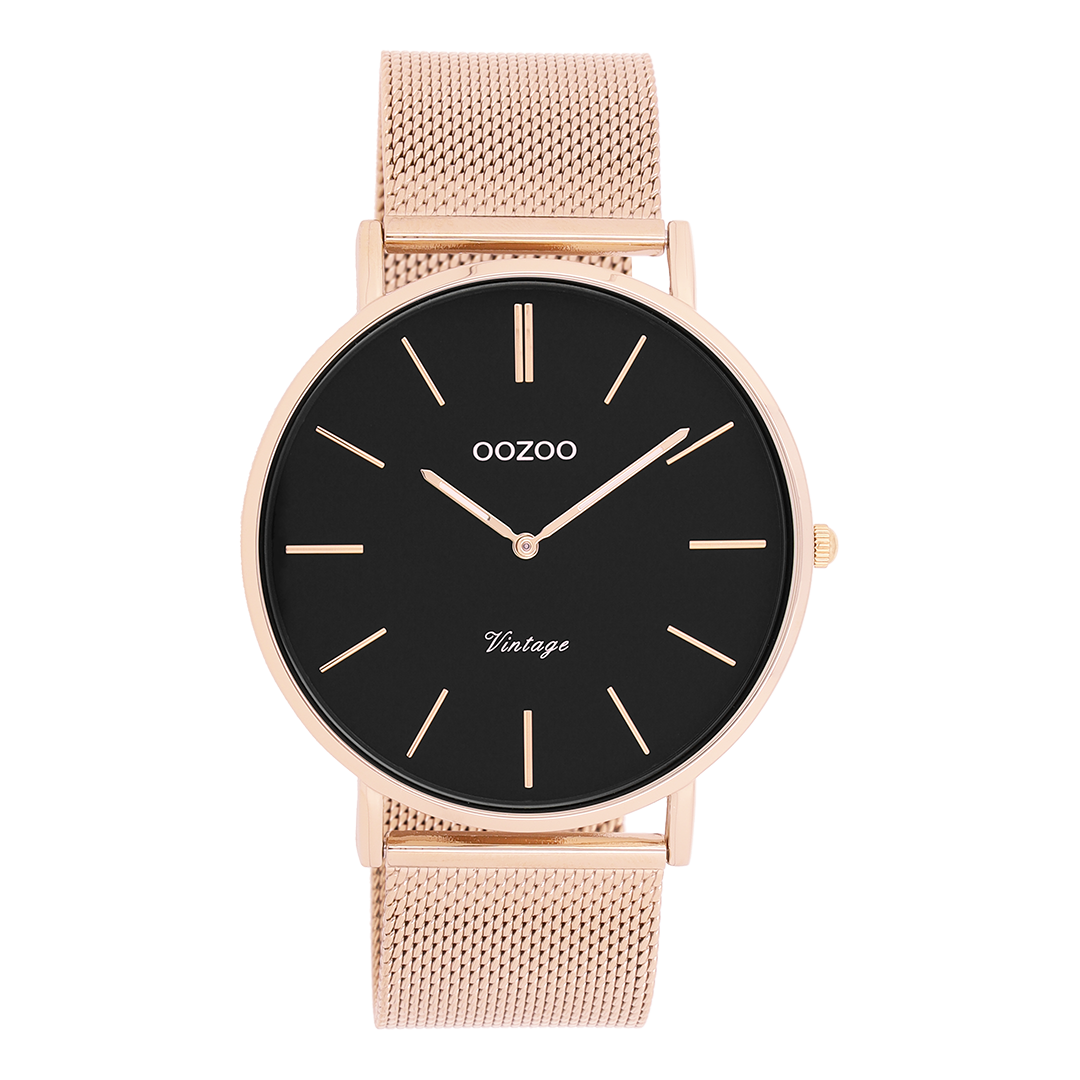 Verfijning en elegantie zijn de twee sleutelelementen van deze prachtige OOZOO Vintage series. Dit klassieke ronde model past bij iedereen. Dit unisex horloge is de perfecte combinatie van comfort en fashion met zijn 44 mm rosé goudkleurige metalen horlogekast en zwarte wijzerplaat. De rosé goudkleurige metalen mesh armband maakt dit horloge tot een all-time classic welke je bij iedere gelegenheid kunt dragen. De wijzerplaat heeft rosé goudkleurige strepen tijdsaanduidingen en bijpassende kleurige wijzers. Dit model is een must-have voor jouw dagelijkse garderobe. Het mineraalglas ligt in een 6,9 mm dunne metalen horlogekast met IP-plating. De C9924 heeft een stainless steel achterplaat en is nikkel-safe. Dit horloge heeft een 2 Japans uurwerk en wordt gedekt door een garantie van 2 jaar (zie sectie 3 van onze Refund, shipping & warranty policy).