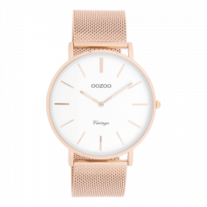 Verfijning en elegantie zijn de twee sleutelelementen van deze prachtige OOZOO Vintage series. Dit klassieke ronde model past bij iedereen. Dit unisex horloge is de perfecte combinatie van comfort en fashion met zijn 44 mm rosé goudkleurige metalen horlogekast en witte wijzerplaat. De rosé goudkleurige metalen mesh armband maakt dit horloge tot een all-time classic welke je bij iedere gelegenheid kunt dragen. De wijzerplaat heeft rosé goudkleurige strepen tijdsaanduidingen en bijpassende kleurige wijzers. Dit model is een must-have voor jouw dagelijkse garderobe. Het mineraalglas ligt in een 6,9 mm dunne metalen horlogekast met IP-plating. De C9916 heeft een stainless steel achterplaat en is nikkel-safe. Dit horloge heeft een 2 Japans uurwerk en wordt gedekt door een garantie van 2 jaar (zie sectie 3 van onze Refund, shipping & warranty policy).