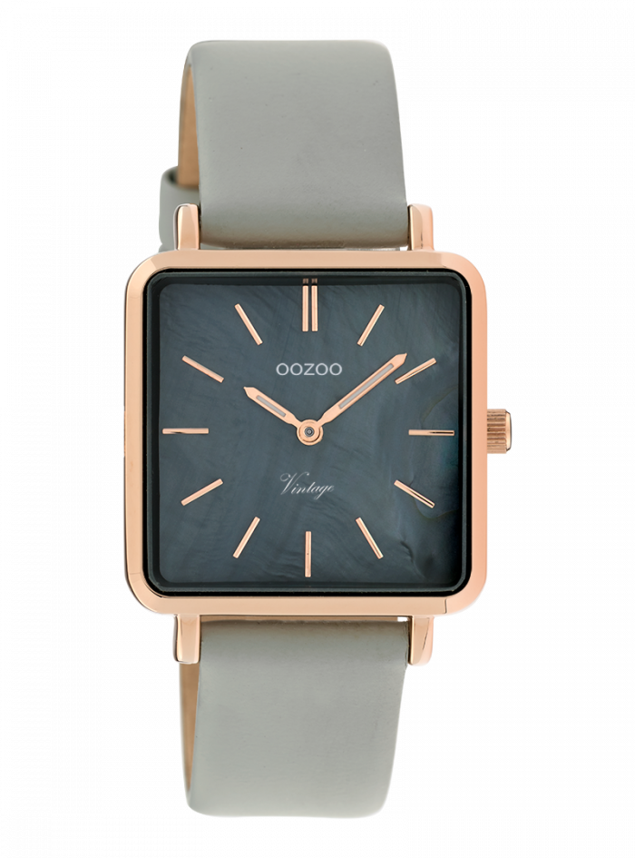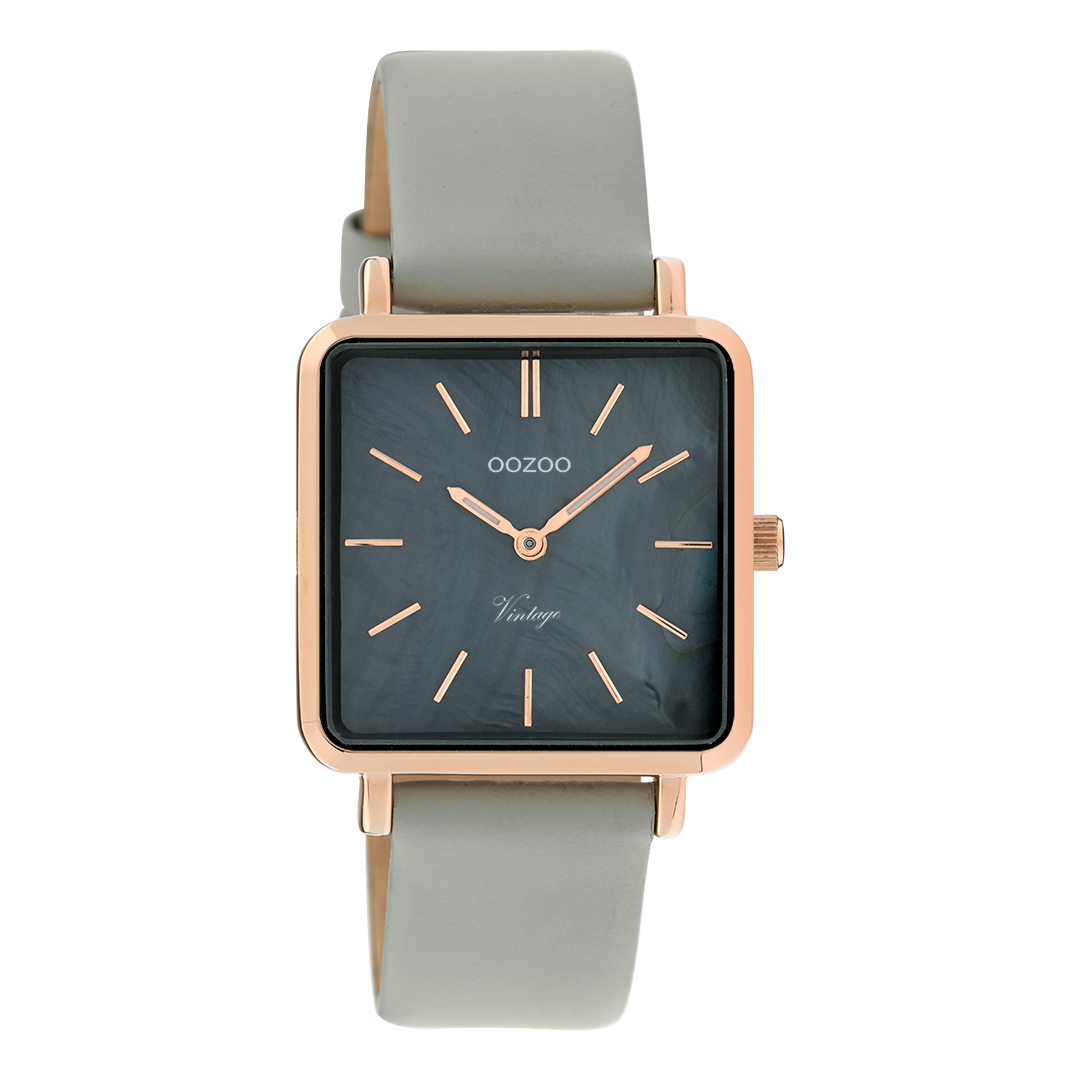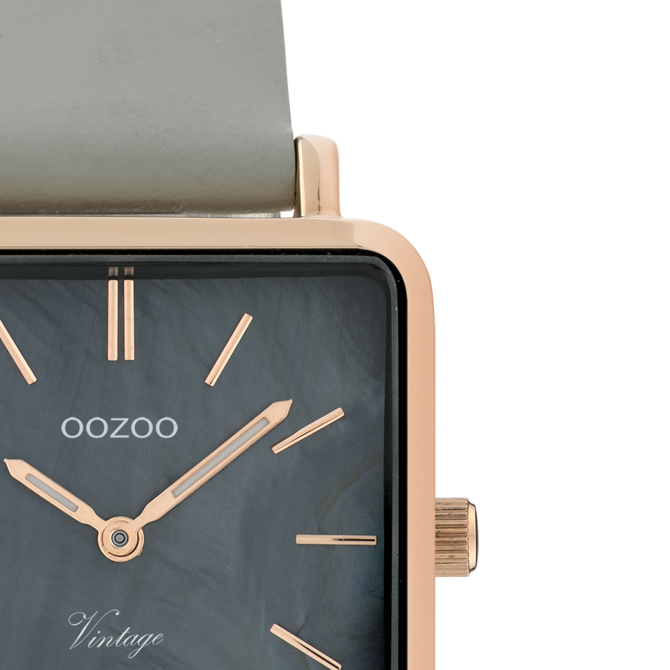 De klassieke look blijft centraal staan in deze trendy serie en daarom is dit OOZOO vintage vierkante design met een speelse knipoog dé musthave van het seizoen! Dit dames horloge is de perfecte combinatie van comfort en fashion met zijn 29 mm rosé goudkleurige metalen horlogekast en zwarte met parelmoer wijzerplaat. De wijzerplaat heeft rosé goudkleurige strepen tijdsaanduidingen en bijpassende kleurige wijzers. De steengrijze leren band maakt dit horloge tot een trendy accessoire dat je elke dag kunt dragen. Dit horloge voegt de sprankeling toe aan je outfit. Het mineraalglas ligt in een 6,9 mm dunne metalen horlogekast met IP-plating. De C9947 heeft een stainless steel achterplaat en is nikkel-safe. Dit horloge heeft een 2 Japans uurwerk en wordt gedekt door een garantie van 2 jaar (zie sectie 3 van onze Refund, shipping & warranty policy).