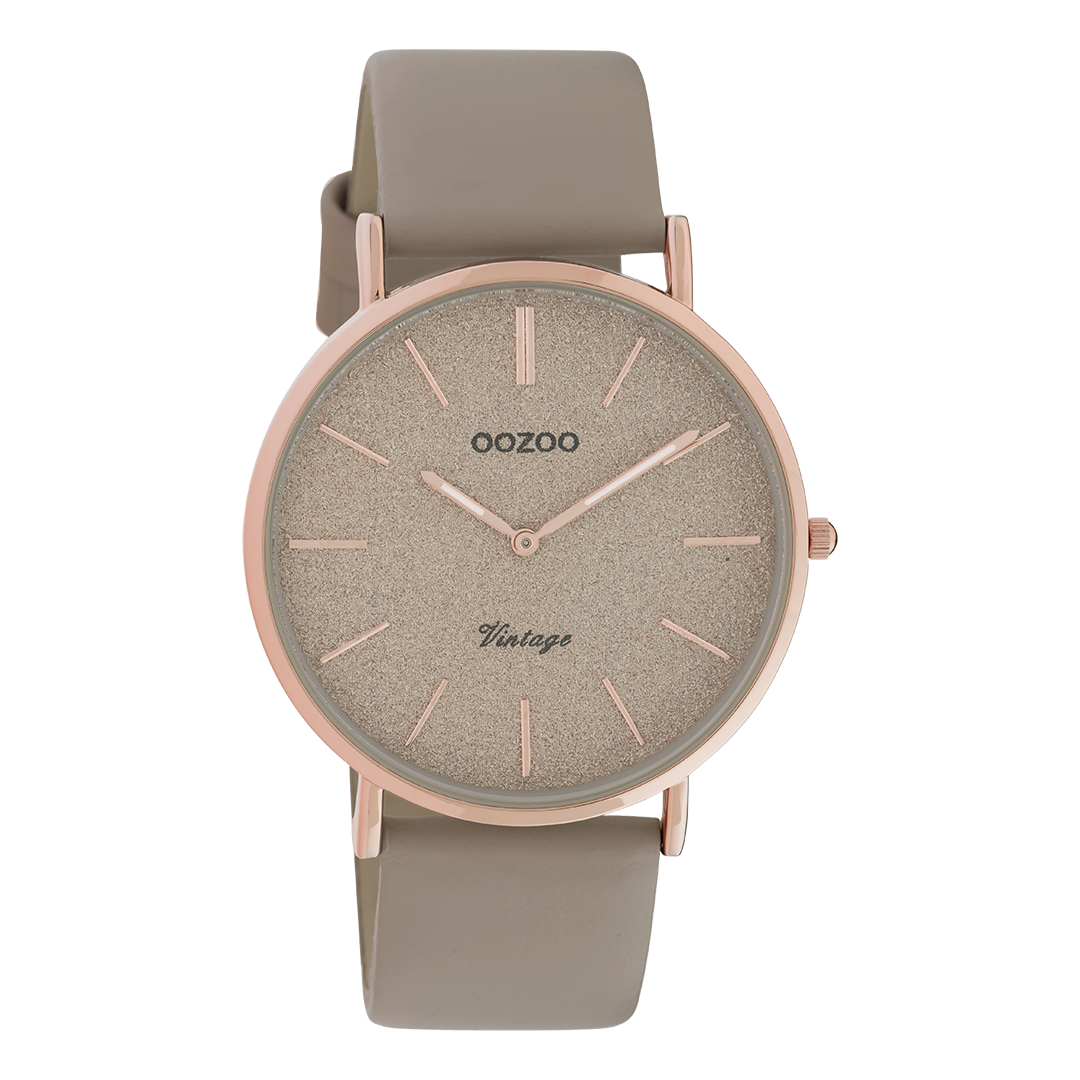 De klassieke look blijft centraal staan in deze trendy serie en daarom is dit OOZOO vintage ronde design met een speelse knipoog dé musthave van het seizoen! Dit dames horloge is de perfecte combinatie van comfort en fashion met zijn 40 mm rosé goudkleurige metalen horlogekast en taupe met glitter wijzerplaat. De wijzerplaat heeft rosé goudkleurige strepen tijdsaanduidingen en bijpassende kleurige wijzers. De taupe leren band maakt dit horloge tot een trendy accessoire dat je elke dag kunt dragen. Dit horloge voegt de sprankeling toe aan je outfit. Het mineraalglas ligt in een 6,9 mm dunne metalen horlogekast met IP-plating. De C20167 heeft een stainless steel achterplaat en is nikkel-safe. Dit horloge heeft een 2 Japans uurwerk en wordt gedekt door een garantie van 2 jaar (zie sectie 3 van onze Refund, shipping & warranty policy).