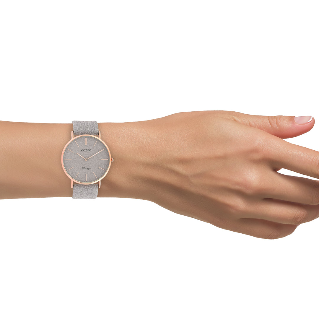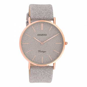 De klassieke look blijft centraal staan in deze trendy serie en daarom is dit OOZOO vintage ronde design met een speelse knipoog dé musthave van het seizoen! Dit dames horloge is de perfecte combinatie van comfort en fashion met zijn 40 mm rosé goudkleurige metalen horlogekast en taupe met glitter wijzerplaat. De wijzerplaat heeft rosé goudkleurige strepen tijdsaanduidingen en bijpassende kleurige wijzers. De taupe glitter leren band maakt dit horloge tot een trendy accessoire dat je elke dag kunt dragen. Dit horloge voegt de sprankeling toe aan je outfit. Het mineraalglas ligt in een 6,9 mm dunne metalen horlogekast met IP-plating. De C20162 heeft een stainless steel achterplaat en is nikkel-safe. Dit horloge heeft een 2 Japans uurwerk en wordt gedekt door een garantie van 2 jaar (zie sectie 3 van onze Refund, shipping & warranty policy).