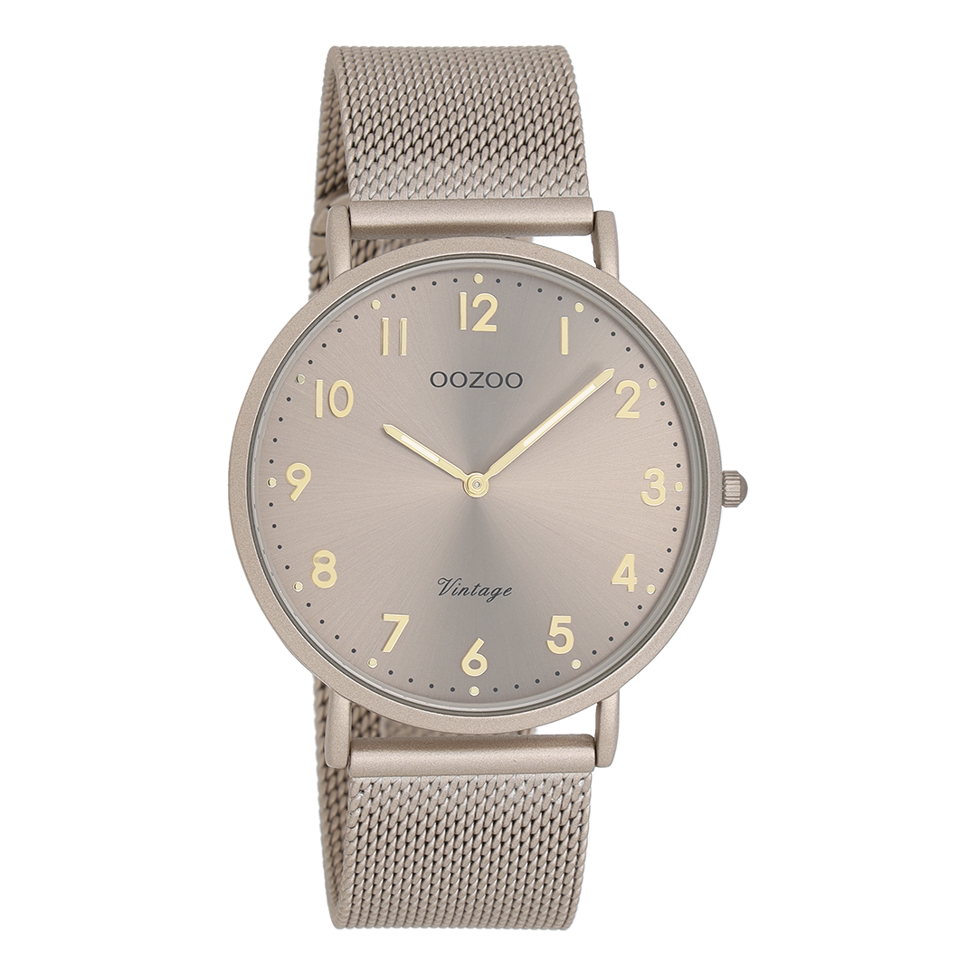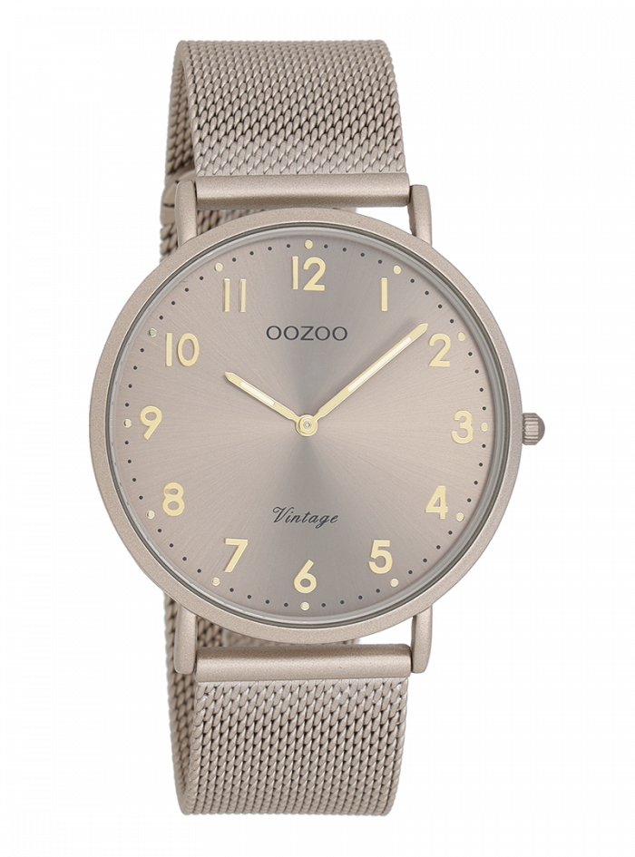 De klassieke look blijft centraal staan in deze trendy serie en daarom is dit OOZOO vintage ronde design met een speelse knipoog dé musthave van het seizoen! Dit unisex horloge is de perfecte combinatie van comfort en fashion met zijn 40 mm taupe matte horlogekast en taupe sunray wijzerplaat. De wijzerplaat heeft zwart/goudkleurige stippen en cijfers tijdsaanduidingen en goudkleurig/witte kleurige wijzers. De taupe matte metalen mesh armband maakt dit horloge tot een trendy accessoire dat je elke dag kunt dragen. Dit horloge voegt de sprankeling toe aan je outfit. Het mineraalglas ligt in een 6,5 mm dunne metalen horlogekast met IP-plating. De C20380 heeft een stainless steel achterplaat en is nikkel-safe. Dit horloge heeft een 2ATM Japans uurwerk en wordt gedekt door een garantie van 2 jaar (zie sectie 3 van onze Refund, shipping & warranty policy).
