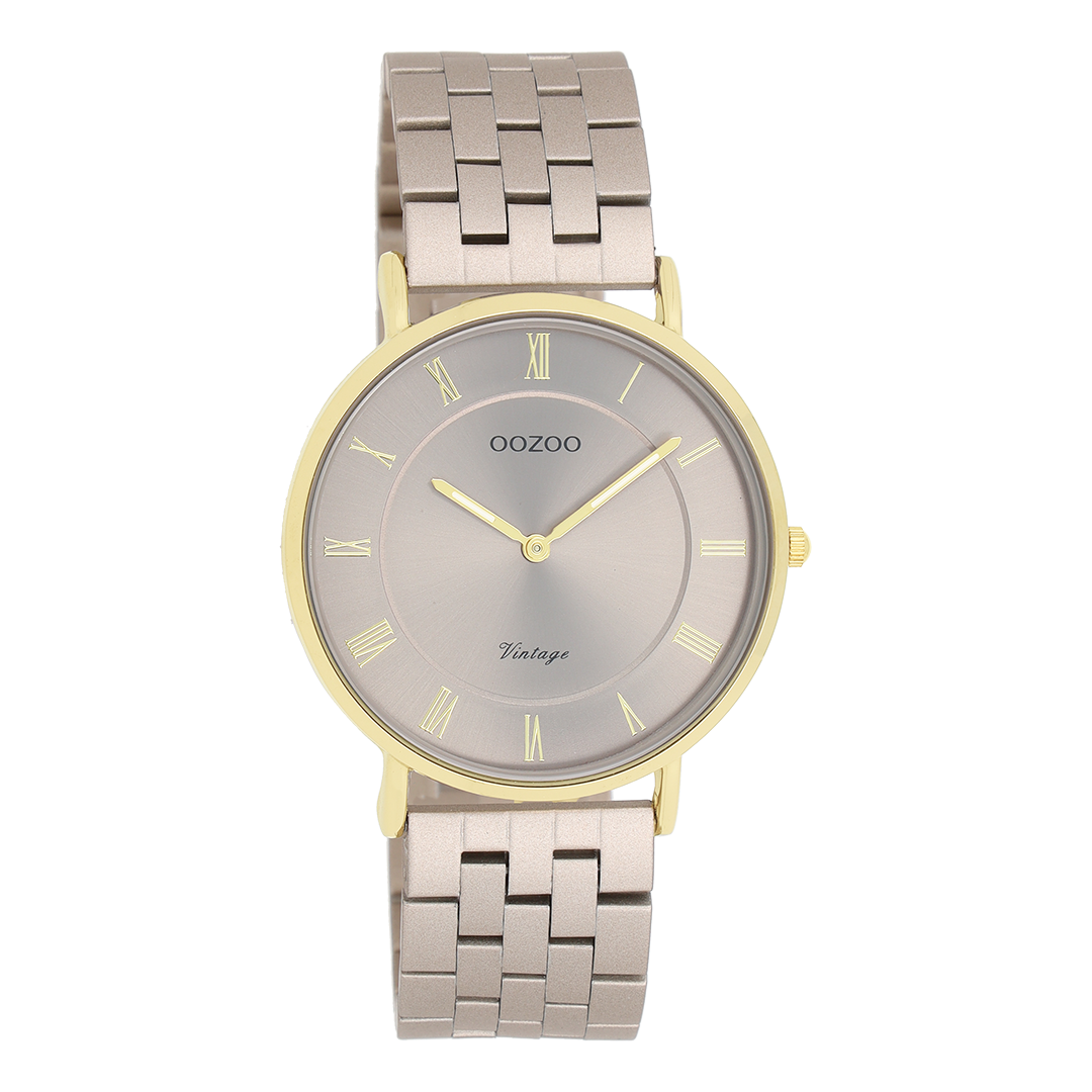De klassieke look blijft centraal staan in deze trendy serie en daarom is dit OOZOO vintage ronde design met een speelse knipoog dé musthave van het seizoen! Dit unisex horloge is de perfecte combinatie van comfort en fashion met zijn 36 mm taupe metalen horlogekast en taupe sunray wijzerplaat. De wijzerplaat heeft goudkleurige romeinse cijfers tijdsaanduidingen en bijpassende kleurige wijzers. De taupe matte roestvrijstalen armband maakt dit horloge tot een trendy accessoire dat je elke dag kunt dragen. Dit horloge voegt de sprankeling toe aan je outfit. Het mineraalglas ligt in een 6,7 mm dunne metalen horlogekast met IP-plating. De C20368 heeft een stainless steel achterplaat en is nikkel-safe. Dit horloge heeft een 2ATM Japans uurwerk en wordt gedekt door een garantie van 2 jaar (zie sectie 3 van onze Refund, shipping & warranty policy).