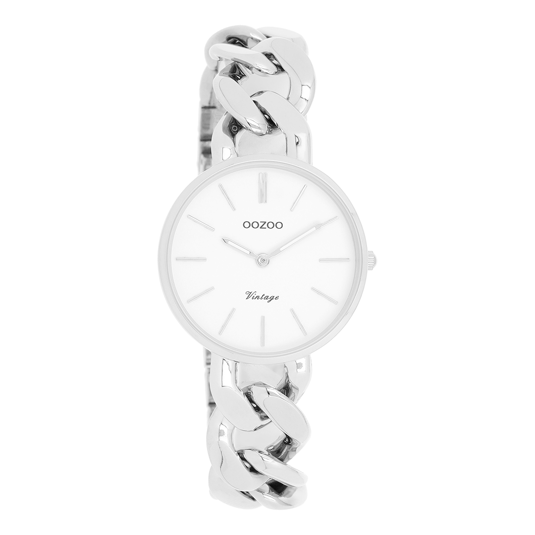 De klassieke look blijft centraal staan in deze trendy serie en daarom is dit OOZOO vintage ronde design met een speelse knipoog dé musthave van het seizoen! Dit dames horloge is de perfecte combinatie van comfort en fashion met zijn 32 mm zilverkleurige metalen horlogekast en witte wijzerplaat. De wijzerplaat heeft zilverkleurige strepen tijdsaanduidingen en bijpassende kleurige wijzers. De zilverkleurige grove schakelarmband maakt dit horloge tot een trendy accessoire dat je elke dag kunt dragen. Dit horloge voegt de sprankeling toe aan je outfit. Het mineraalglas ligt in een 6,9 mm dunne metalen horlogekast met IP-plating. De C20355 heeft een stainless steel achterplaat en is nikkel-safe. Dit horloge heeft een 2ATM Japans uurwerk en wordt gedekt door een garantie van 2 jaar (zie sectie 3 van onze Refund, shipping & warranty policy).
