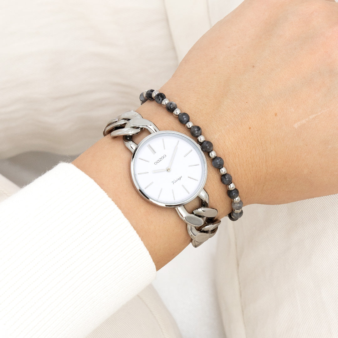 Zilverkleurige horloge met zilverkleurige grove schakelarmband