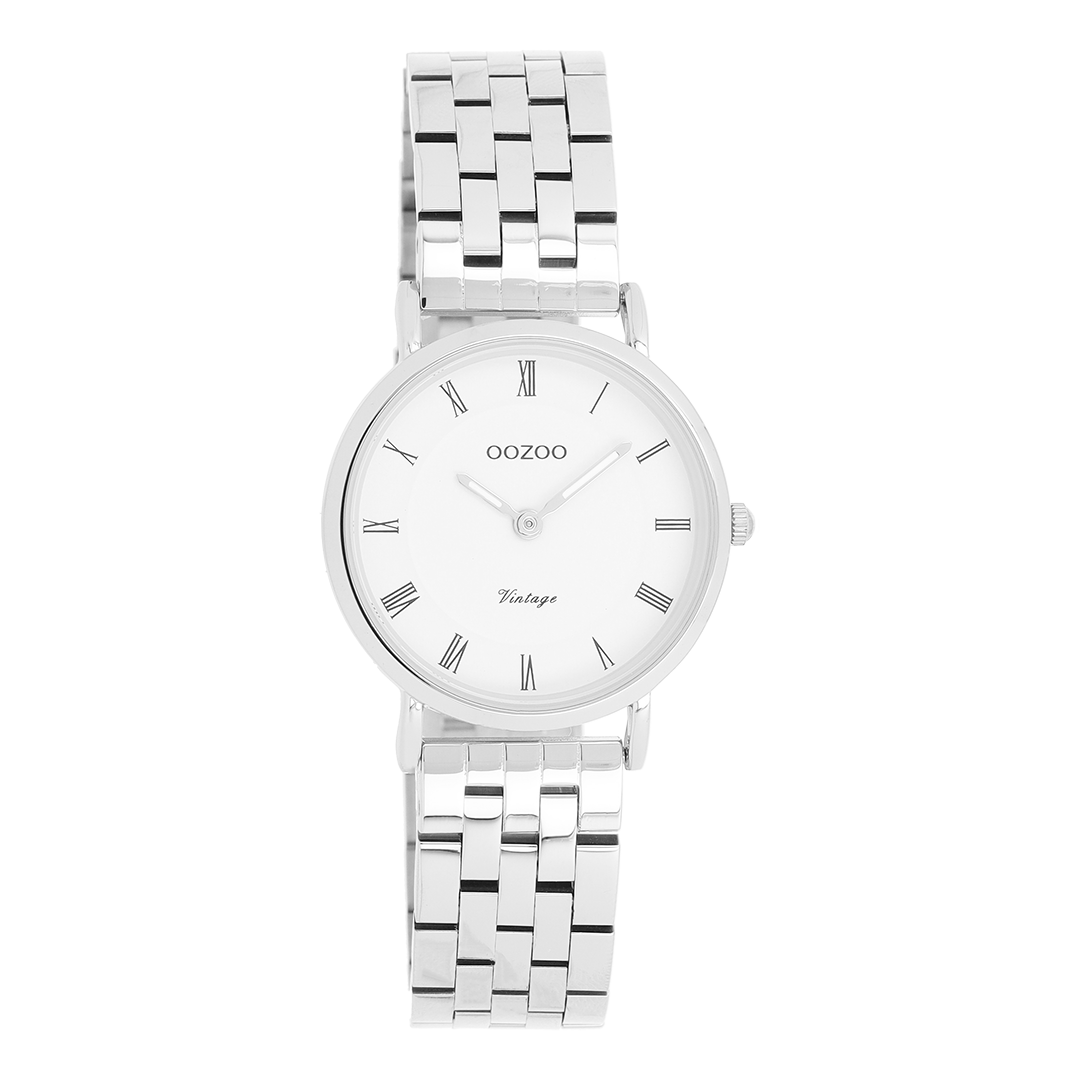 De klassieke look blijft centraal staan in deze trendy serie en daarom is dit OOZOO vintage ronde design met een speelse knipoog dé musthave van het seizoen! Dit unisex horloge is de perfecte combinatie van comfort en fashion met zijn 28 mm zilverkleurige metalen horlogekast en witte wijzerplaat. De wijzerplaat heeft zwarte romeinse cijfers tijdsaanduidingen en zilverkleurig/witte kleurige wijzers. De zilverkleurige glanzende roestvrijstalen armband maakt dit horloge tot een trendy accessoire dat je elke dag kunt dragen. Dit horloge voegt de sprankeling toe aan je outfit. Het mineraalglas ligt in een 6,7 mm dunne metalen horlogekast met IP-plating. De C20372 heeft een stainless steel achterplaat en is nikkel-safe. Dit horloge heeft een 2ATM Japans uurwerk en wordt gedekt door een garantie van 2 jaar (zie sectie 3 van onze Refund, shipping & warranty policy).
